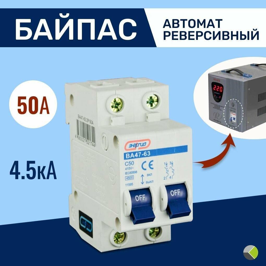 Байпас 2Р 50А Энергия предназначен для подачи в ручном режиме напряжения в обход какого-либо устройства. В основном используются со стабилизаторами напряжения. Возможность одновременного включения двух клавиш блокирована. Благодаря использованию Байпас 2Р 50А в случае аварии или неполадок стабилизатора напряжения или другого устройства потребитель остается подключенным к электросети даже во время ремонтных работ. Автоматический выключатель Байпас 2Р 50А применяется также в ситуациях, когда нет необходимости в непрерывной круглосуточной работе стабилизатора напряжения. В этом случае с целью экономии ресурса стабилизатор включается в цепь только на определенное время. Оборудование должно эксплуатироваться в помещениях не содержащих коррозионных и легко воспламеняющихся газов.