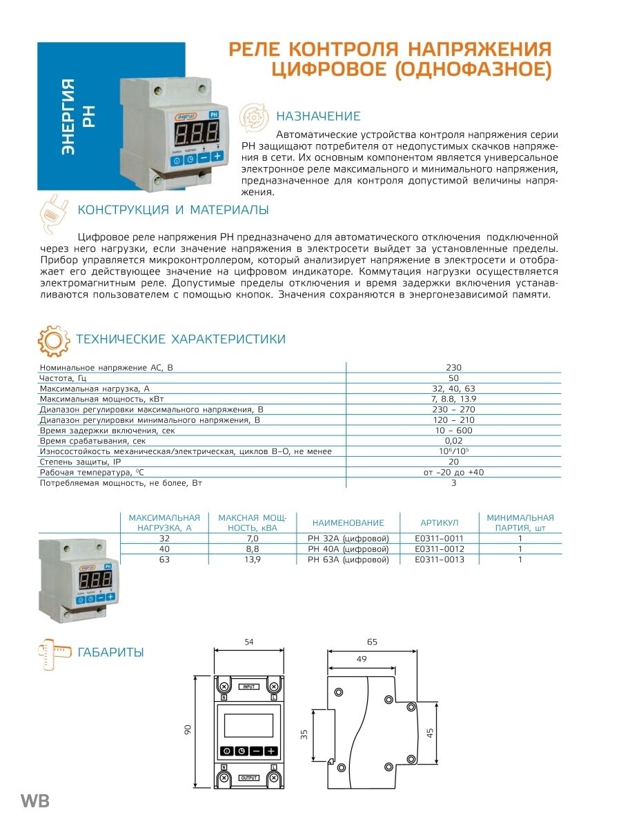Однофазное реле контроля напряжения РН 40А с цифровой индикацией предназначено для автоматического отключения подключенных к нему электроприборов, в случае выхода напряжения в электросети за пределы установленных значений. Прибор управляется микроконтроллером. Анализирует напряжение в электрической сети и отображает его текущее значение на цифровом индикаторе. Коммутация нагрузки осуществляется электромагнитным реле.