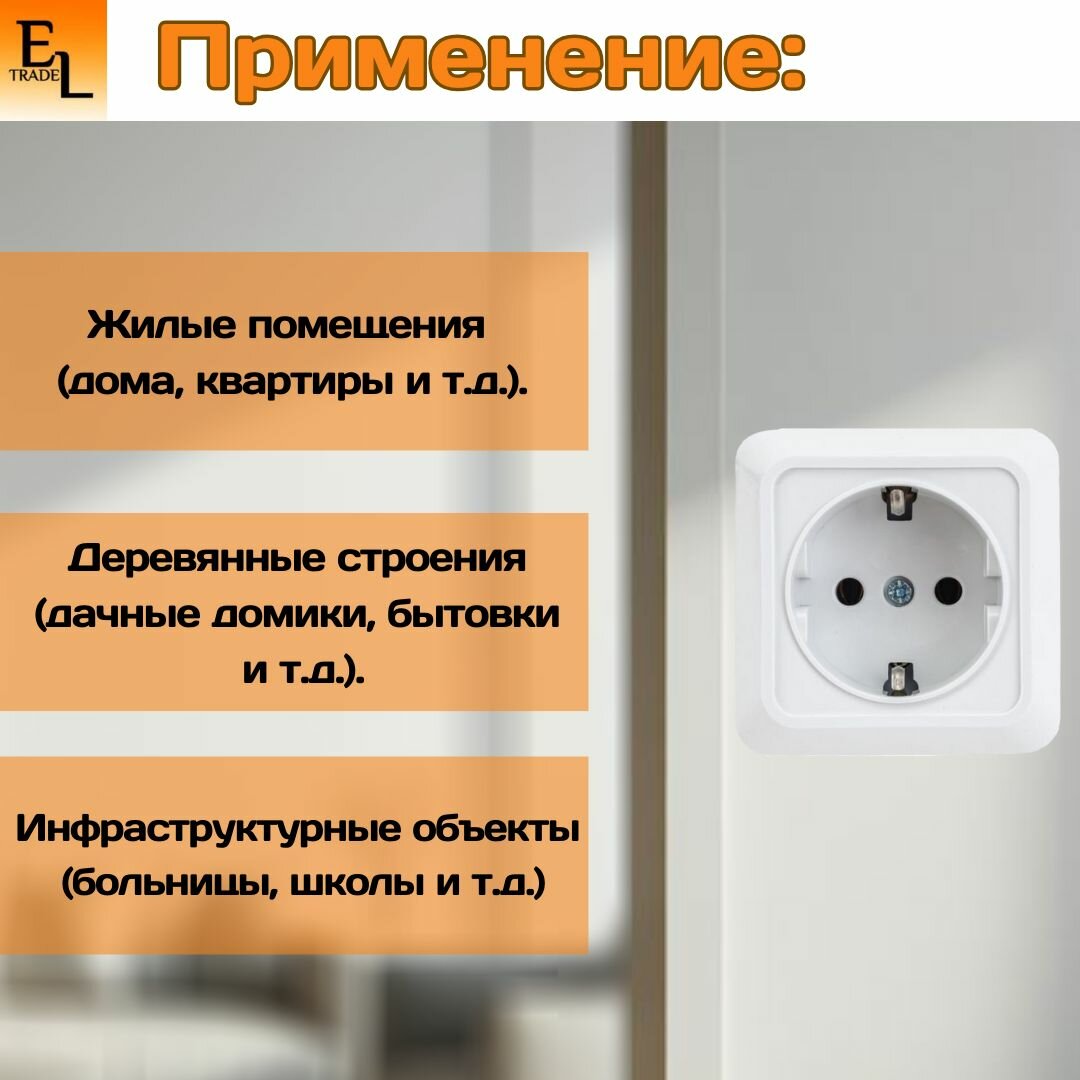 Назначение: Подключение бытовых нагрузок к сети переменного тока. Управление сетями освещения. Подключение коммуникационных устройств к информационным сетям.Применение: Жилые помещения (дома, квартиры и т.д.). Деревянные строения (дачные домики, бытовки и т.д.) Инфраструктурные объекты (больницы, школы и т.д.).Преимущества: Керамическое основание механизмов отличается высокой устойчивостью к внешним воздействиям и длительным сроком службы. Благодаря мостовым винтовым зажимам в розетках возможно создание шлейфа (параллельного соединения нескольких рядом стоящих розеток) без использовании клеммников. Подпружиненный шток выключателя гарантирует надежность и долговечность выключателей. Подпружиненные контакты розеток подходят для вилок со штырями диаметром от 4 до 6 мм без потери своих фиксирующих свойств. К каждому изделию в яркой индивидуальной упаковке со стикером, на который нанесена вся необходимая информация о изделии и штрихкод EAN-13, прилагается паспорт с подробной инструкцией по монтажу.Материалы: Корпус устройств выполнен из самозатухающего АБС-пластика и обеспечивающего прочность, термостойкость изделий и устойчивость к воздействию солнечных лучей. Контакты розеток выполнены из высокоупругой фосфористой бронзы, обеспечивающей надежный контакт и пожаробезопасность на протяжении всего срока службы изделий. Металлокерамические (AgNi) контакты выключателей, получаемые методом спекания смеси их порошков, позволяют сочетать высокую дугостойкость с хорошей проводимостью