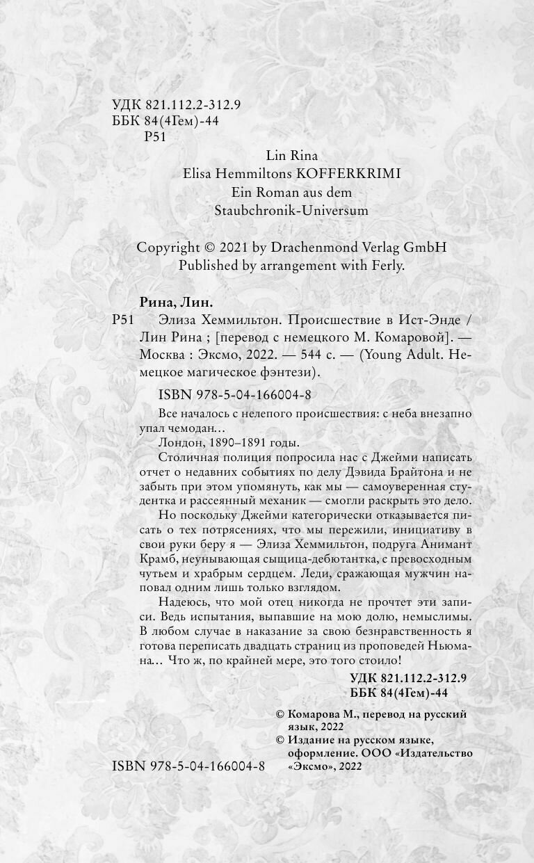 Действие романа происходит параллельно событиям бестселлера «Книжные хроники Анимант Крамб»! История берет свое начало с невероятного случая — с крыши библиотеки мистера Рида падает чемодан… Сама книга оформлена в виде дневника Элизы с пометками Джейми и констебля полиции. Лин Рина продолжает радовать своих читателей с каждой новой историей!
