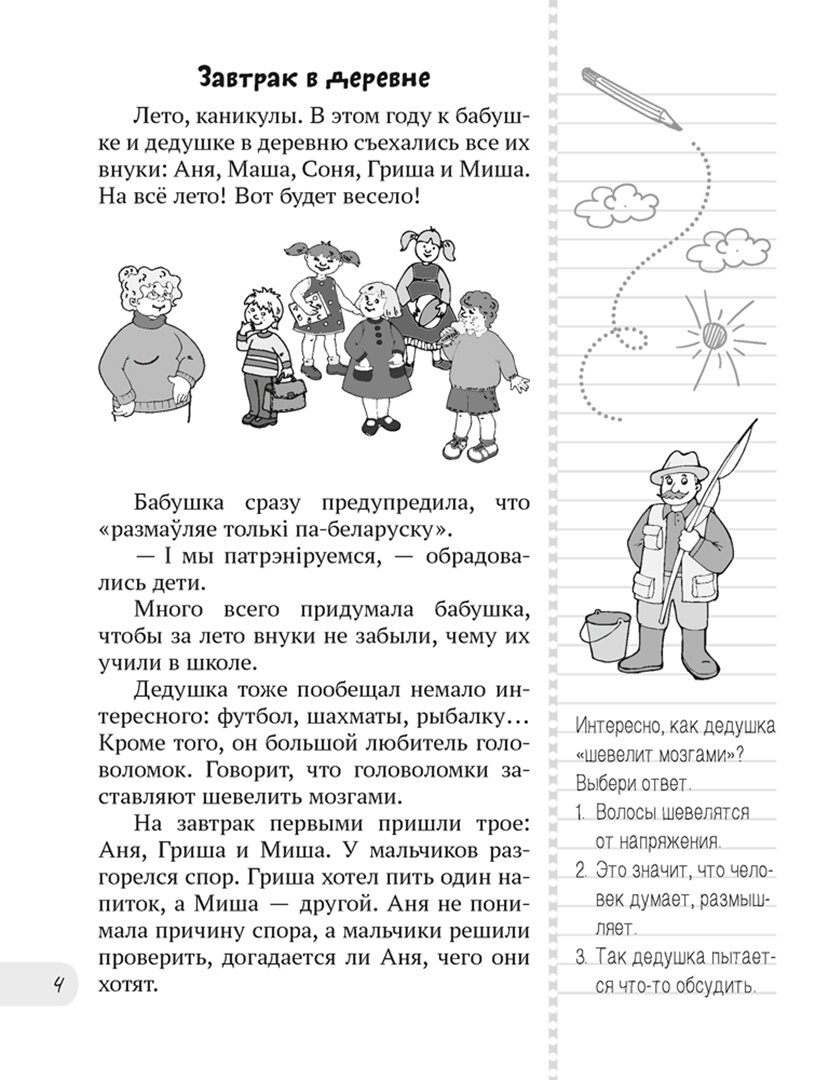 Тетрадь предназначена для занятий во время летних каникул. Задания, вплетённые в увлекательный рассказ, представлены в виде игр, головоломок и занимательных задач, которые помогут школьникам повторить изученный материал сразу по нескольким предметам (обучение грамоте, математика, человек и мир, белорусский язык) и подготовиться к новому учебному году.