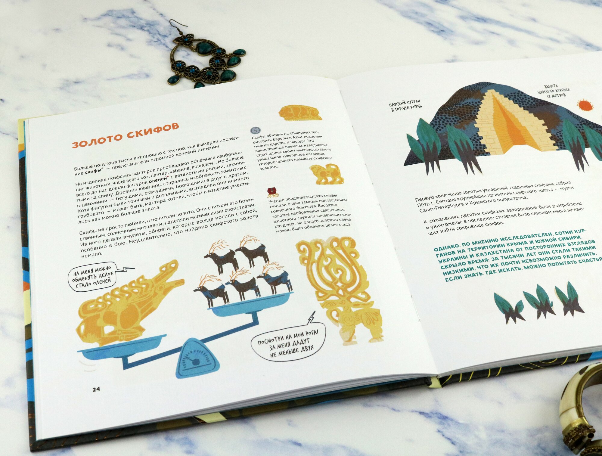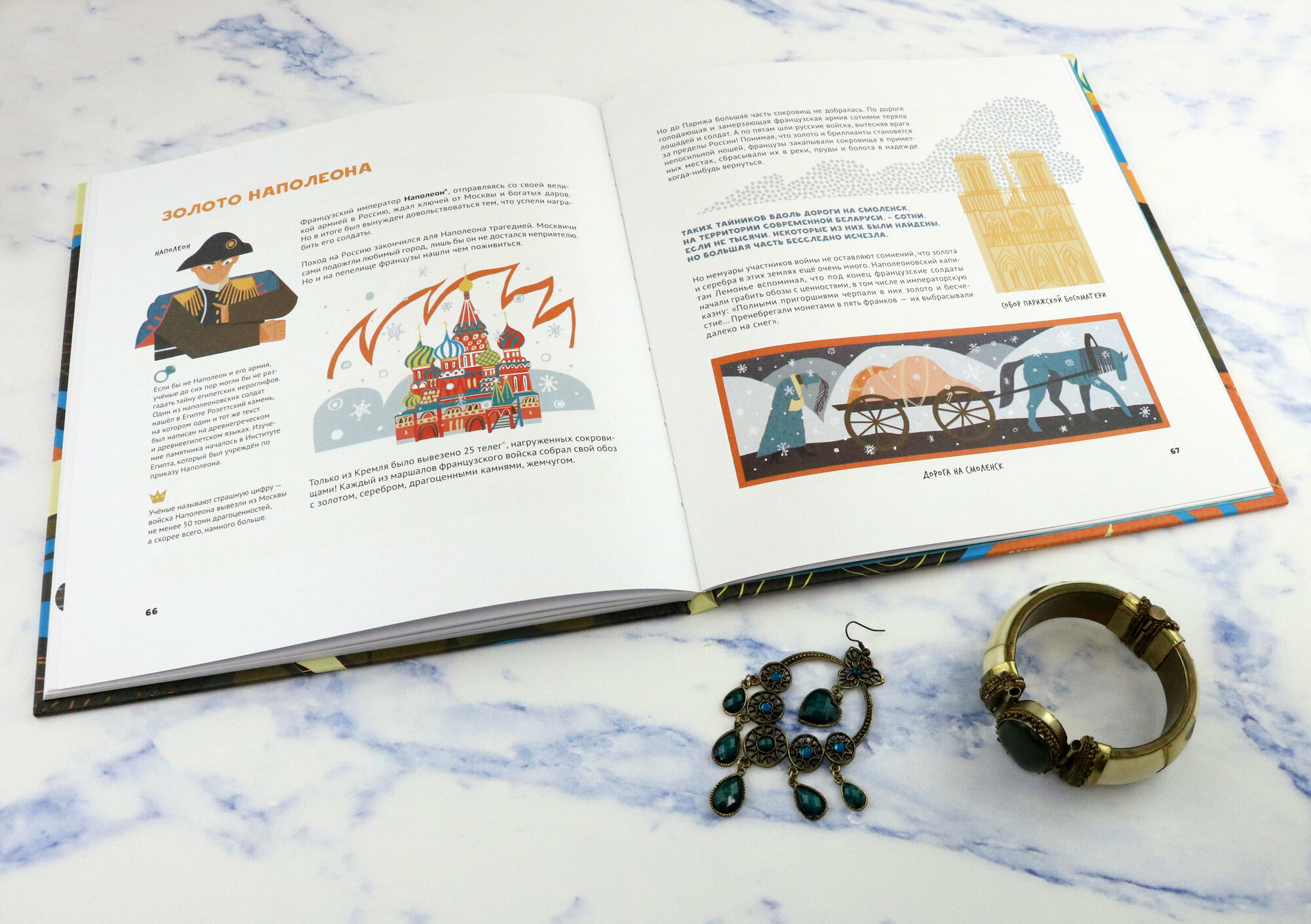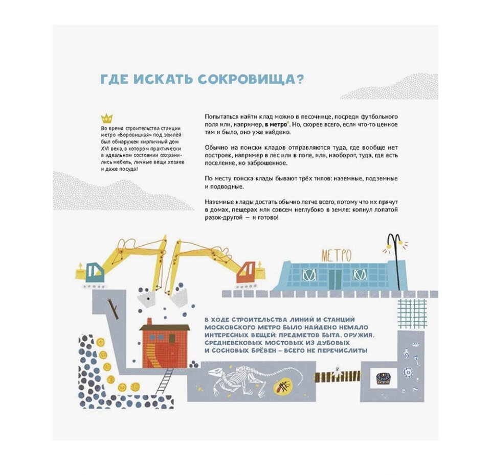 Классный выбор темы для книги! Поэтому мимо мы пройти не смогли. В глаза бросается красивая обложка, картинки внутри тоже хороши. И содержание отличное – кое о чем я знала, но очень многое оказалось новой информацией. Я читала вместе с сыном. Великолепная познавательная литература. Но с побочным эффектом – сын мгновенно захотел купить металлоискатель и пойти искать клад :) И очень заинтересовался различными раскопками
