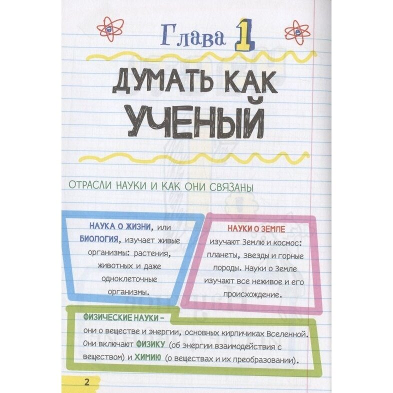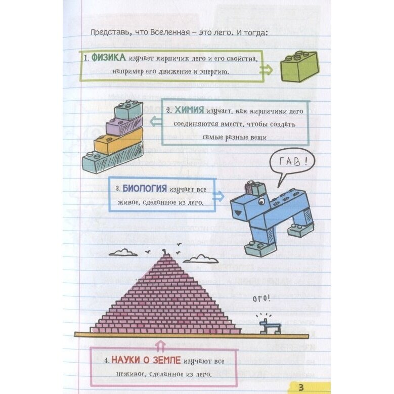 Данный справочник заинтересовал нестандартной подачей материала. Он написан как конспект лекции с забавными рисунками. Там есть определения, схемы, строение. Представлено много тем и предметов естественных наук ( физика, химия, биология, астрономия, география, экология). Ребёнок с интересом стал читать разные темы.