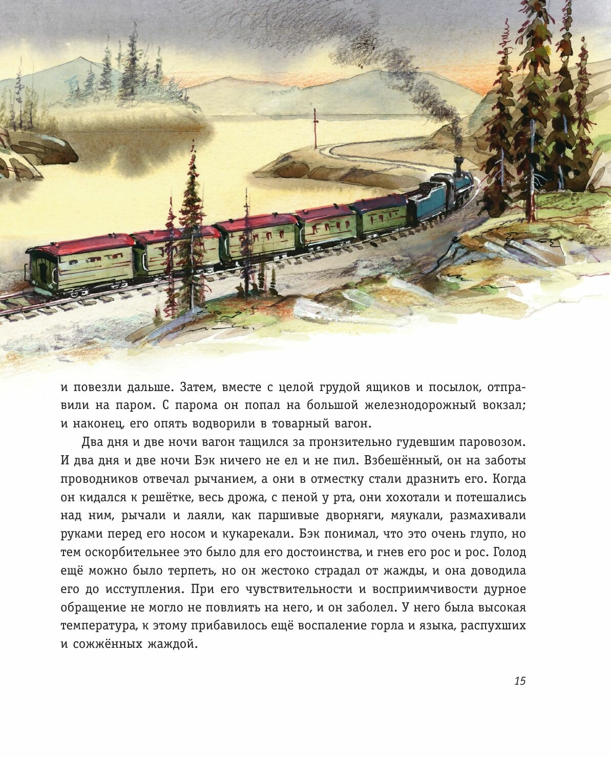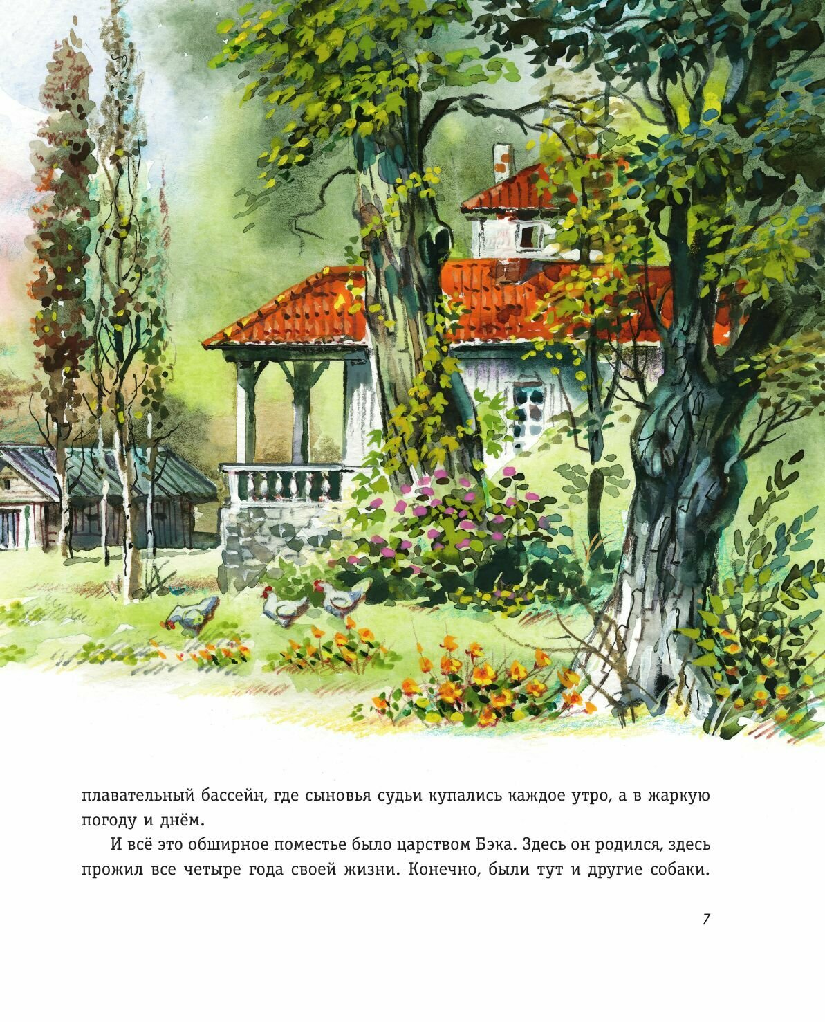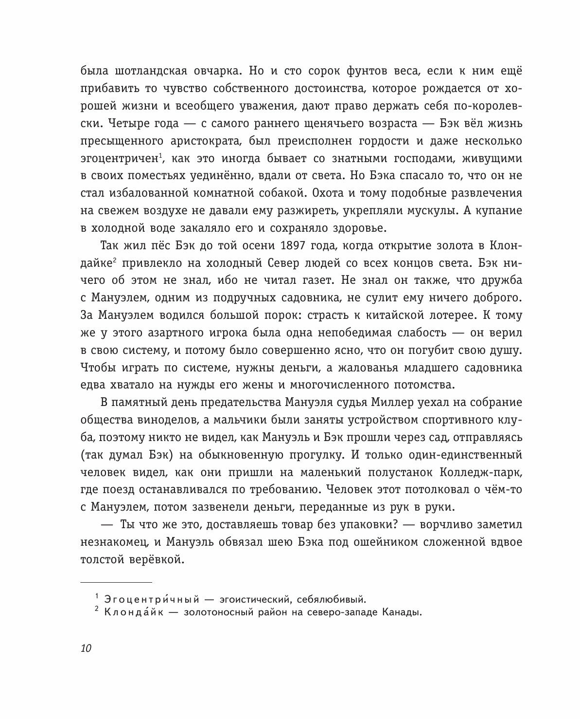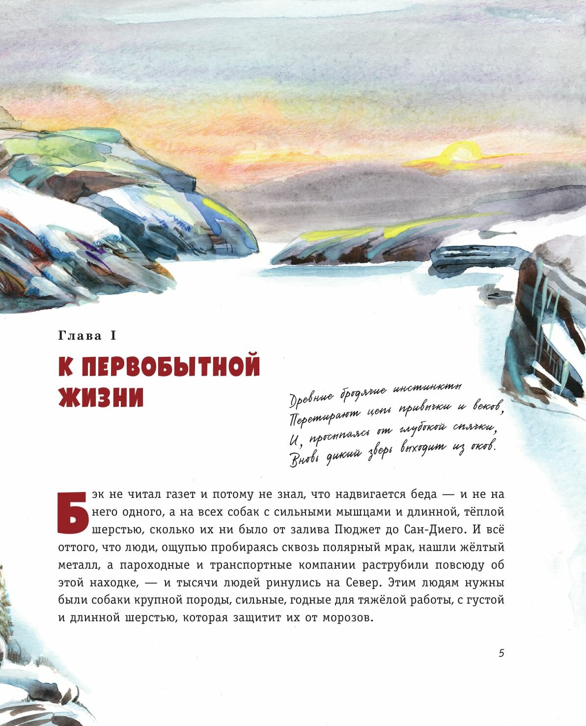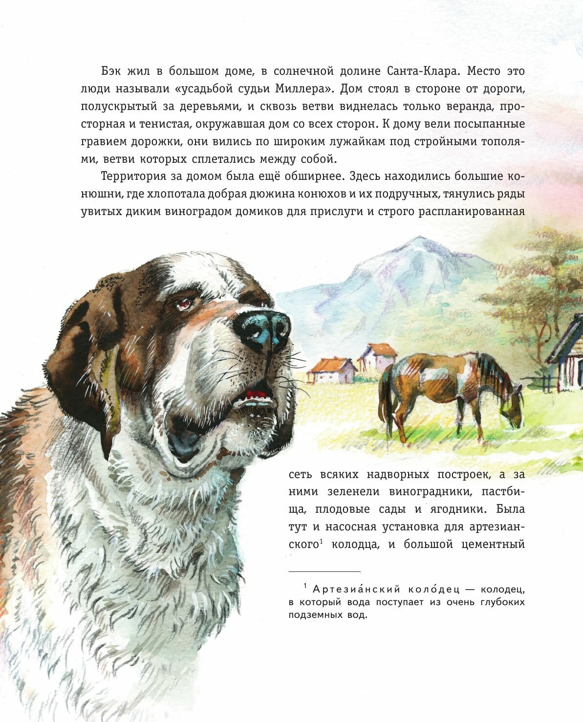 Книгу покупала для сына, помню как в детстве зачитывалась книгами Джека Лондона. История действительно очень трогательная, о домашнем псе Бэке, который из комфортных домашних условий попал на суровый север. Повествование интересное, от лица животного и сюжет держит в напряжении до самого конца. Книга качественно сделана, в твердой обложке и с яркими красочными иллюстрациями.