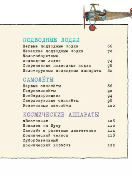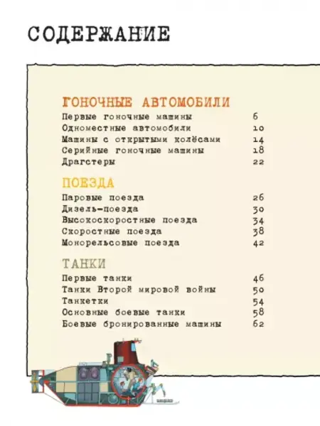 Книга разделена на шесть частей: гоночные автомобили, поезда, танки, подводные лодки, самолёты и космические аппараты. В каждой части читатель сможет прочитать о наиболее интересных моделях, а затем увидеть их в разрезе и рассмотреть самые важные детали поближе. От паровозов, первых гоночных автомобилей, танков и подводных лодок до современных скоростных поездов и машин, реактивных самолётов и пилотируемых подводных аппаратов — всё самое интересное собрано под обложкой одной книги.