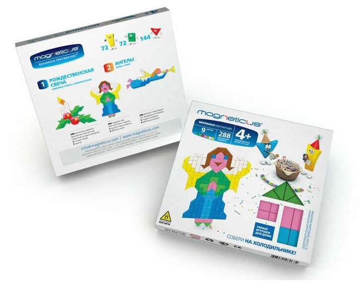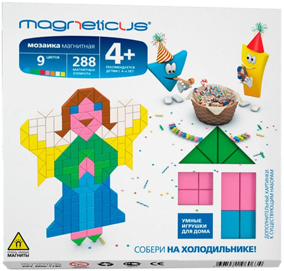Мозайка магнитная Ангелы 288 эл./Мягкая магнитная мозаика Ангелы - это набор, состоящий из геометрических фигур разных цветов и форм и листовки с вариантами сборки картин. Миди-мозаику можно собирать на любой металлической поверхности, поэтому ее удобно брать с собой в гости или короткие поездки. Она отлично сочетается с другими наборами Magneticus, имеющими металлическое игровое поле.Мозаика способствует развитию воображения, мелкой моторики, внимательности, а так же воспитывает в ребенке усидчивость.Состав набора: 288 мягких элементов из ЭВА 9 цветов с магнитным винилом (безопасный, эластичный, приятный на ощупь материал), 3 готовых этюда на коробке (Рождественская свеча, Ангелы).Форма и количество элементов: 72 прямоугольных элемента, 72 квадратных элемента, 144 треугольных элемента размером 1-2 см.Материал: полимерный материал (EVA) с магнитным слоем.Товар соответствует требованиям безопасности продукции.Возраст: от 4-х лет./Развивающие, обучающие игрушки/Мозаики