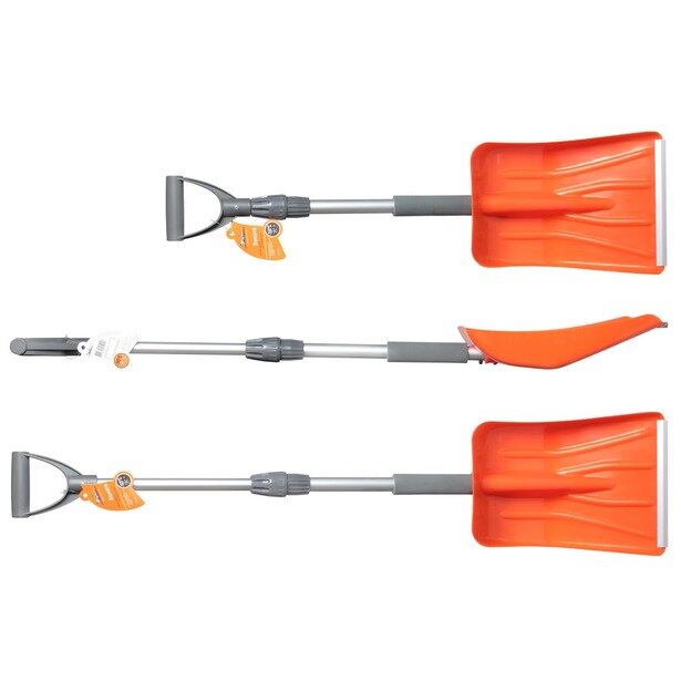 Лопата является идеальной для уборки снега и перевозки в автомобиле. Телескопическая рукоятка лопаты позволяет перевозить изделие в багажнике любого авто. Ковш изготовлен из морозостойкого пластика, который уменьшает вес, облегчая уборку снега. Кант лопаты алюминиевый - для работы с легкой наледью.