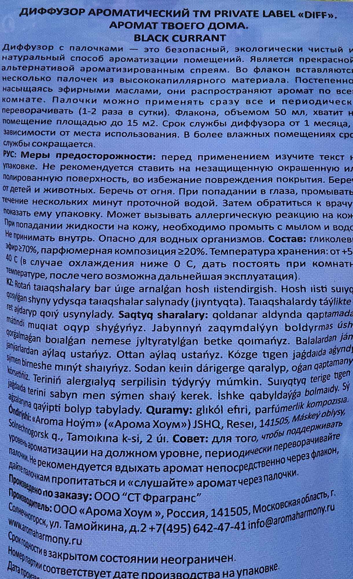 | Модель продукта | Диффузор ароматический Blackcurrant 50мл |