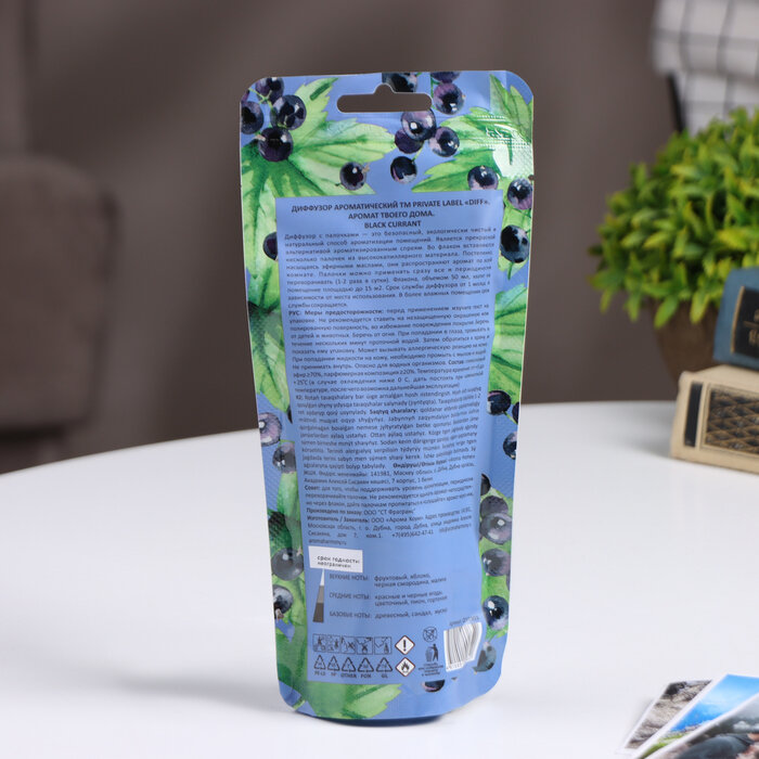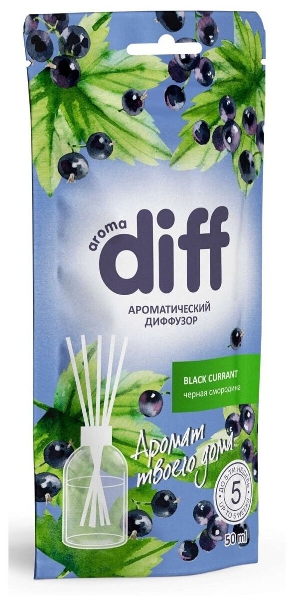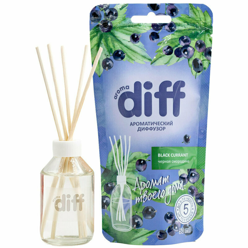 **Ароматический диффузор Diff Blackcurrant** предназначен для создания приятного запаха в квартире, салонах красоты, офисах. Жизнеспособность раствора составляет от 1 месяца. Срок службы во влажных помещениях сокращается. Способен охватывать площадь до 15 м². Отличается безопасностью для человека и животных.