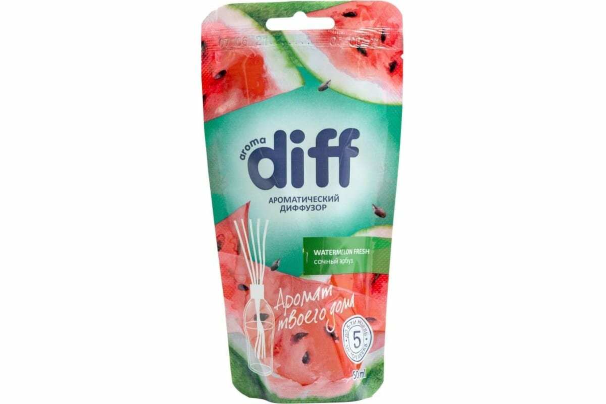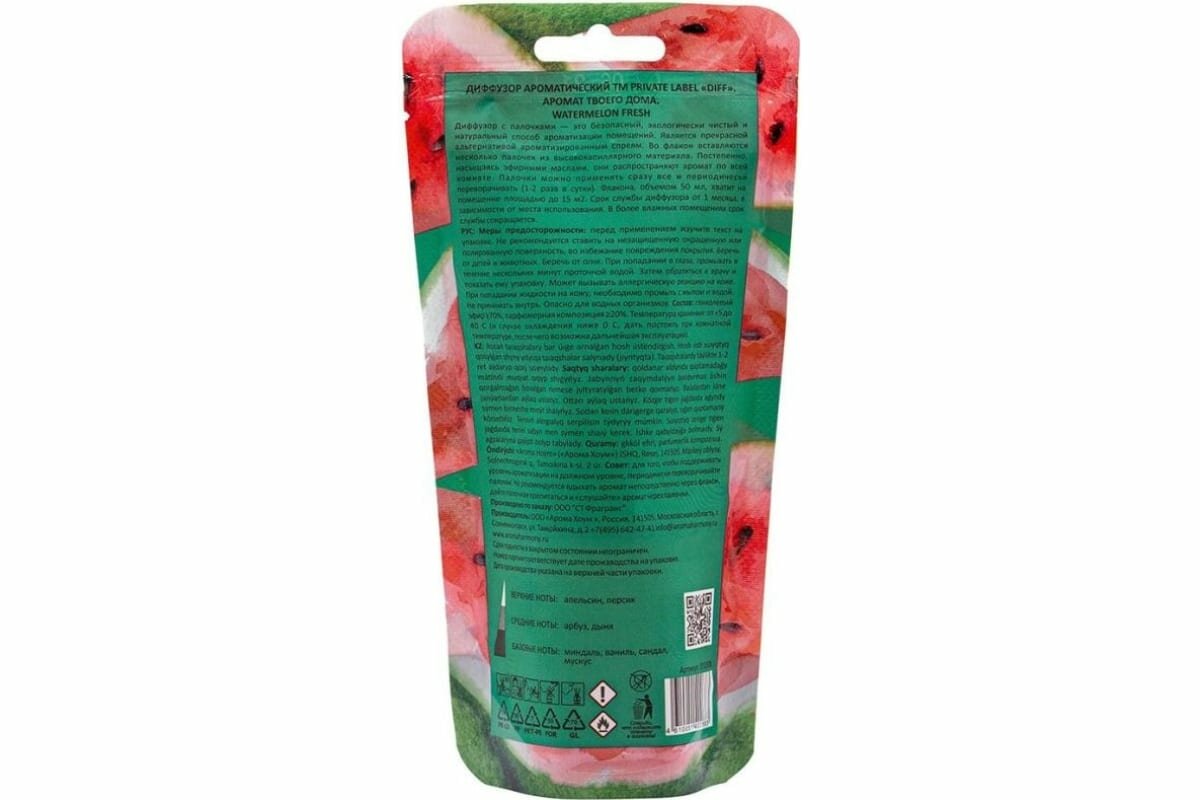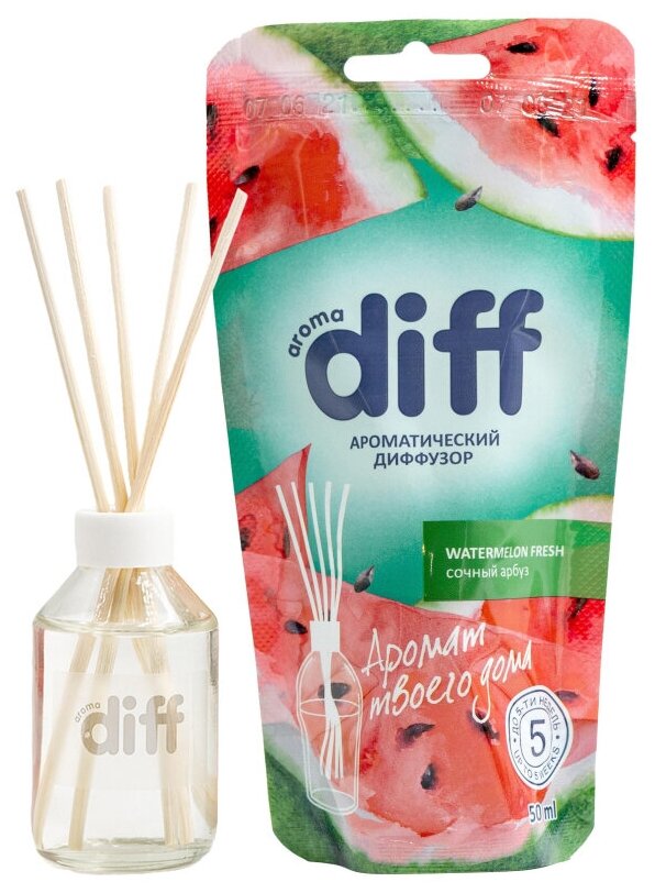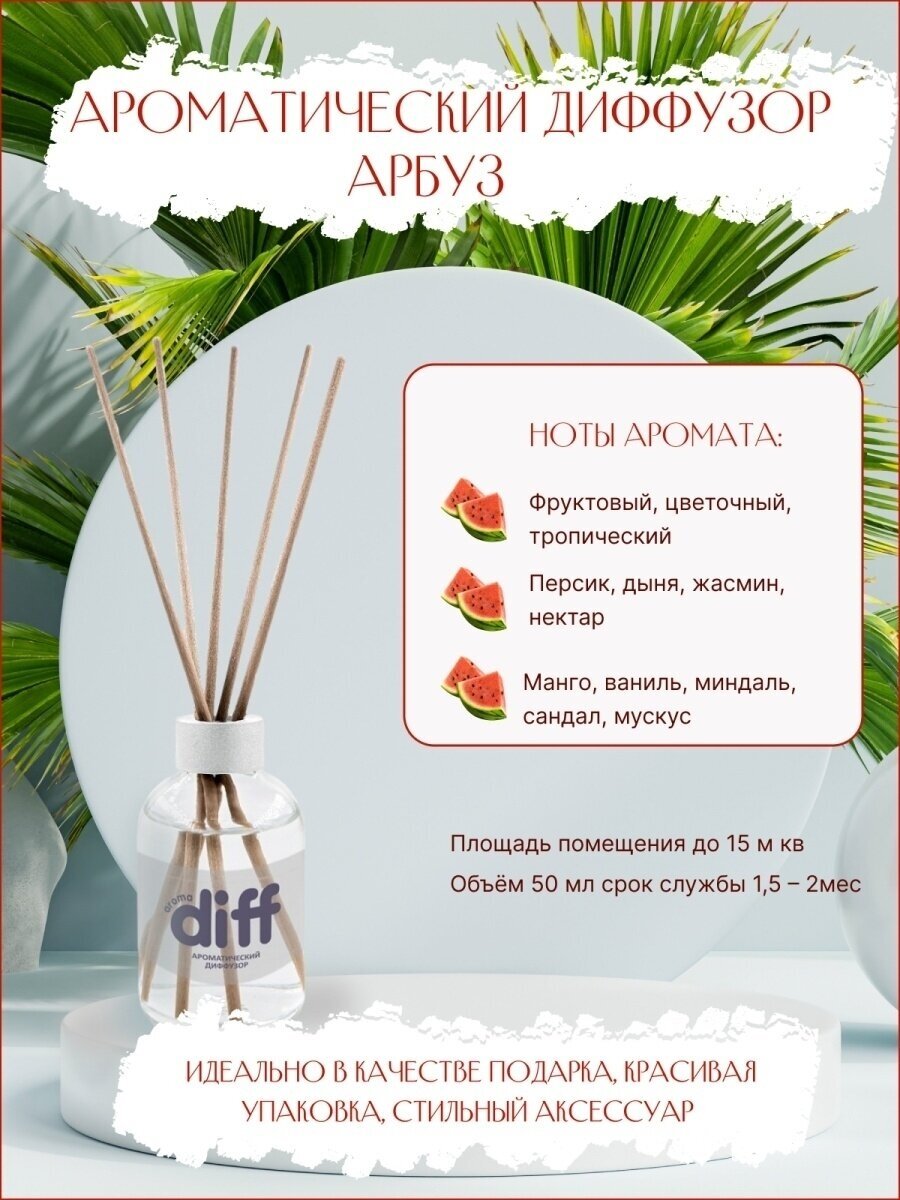 **Ароматический диффузор Diff Watermelon** предназначен для создания приятного запаха в квартире, салонах красоты, офисах. Жизнеспособность раствора составляет от 1 месяца. Срок службы во влажных помещениях сокращается. Способен охватывать площадь до 15 м². Отличается безопасностью для человека и животных.
