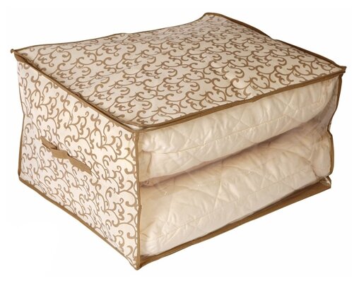 Кофр отлично подходит для хранения одеял и прочих спальных принадлежностей. С его помощью ткань спального комплекта защищается от пыли и влаги, а также сохраняет свою мягкость и яркость. Приспособление удобно располагается внутри шкафа или на полках. Основным преимуществом изделия является удобство в использовании. Благодаря не очень большим размерам при размещении конструкции в значительной степени экономится пространство. К тому же кофр очень просто очищается при помощи обычной влажной тряпки.