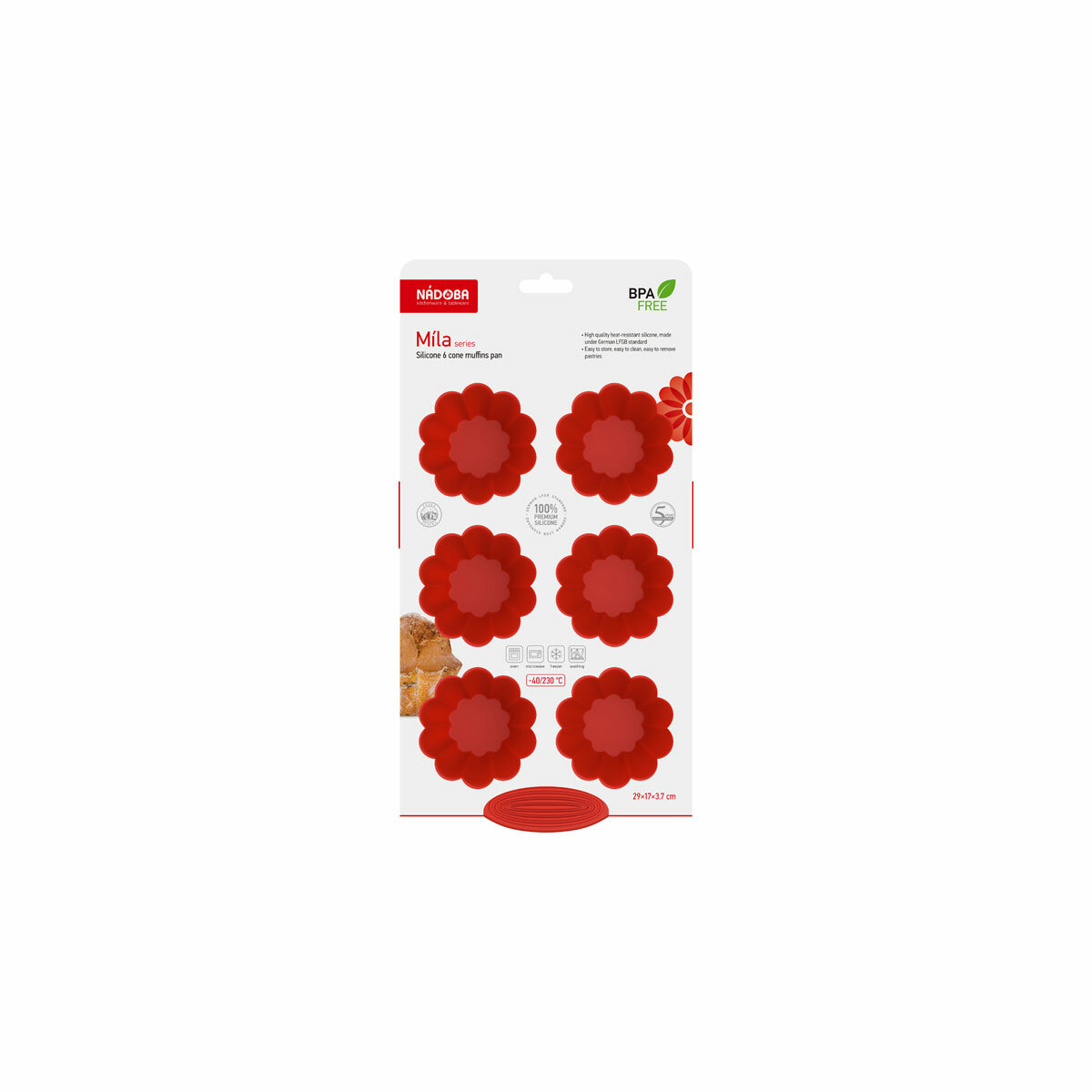 Высококачественный жаропрочный силикон, стандарт LFGB (Германия), не белеет. Рабочие температуры: от 40 до 230 °С. Выпечка легко вынимается и не пригорает. Формы легко моются и их удобно хранить в сложенном виде.