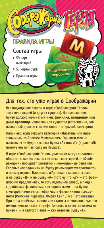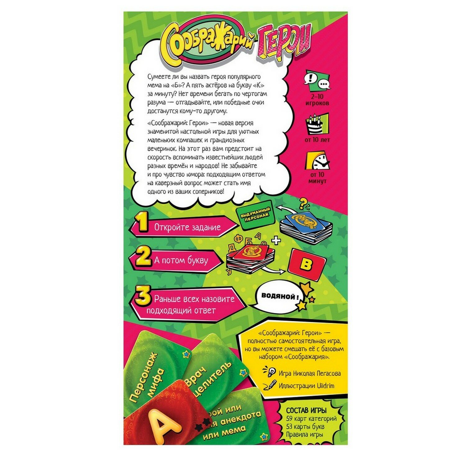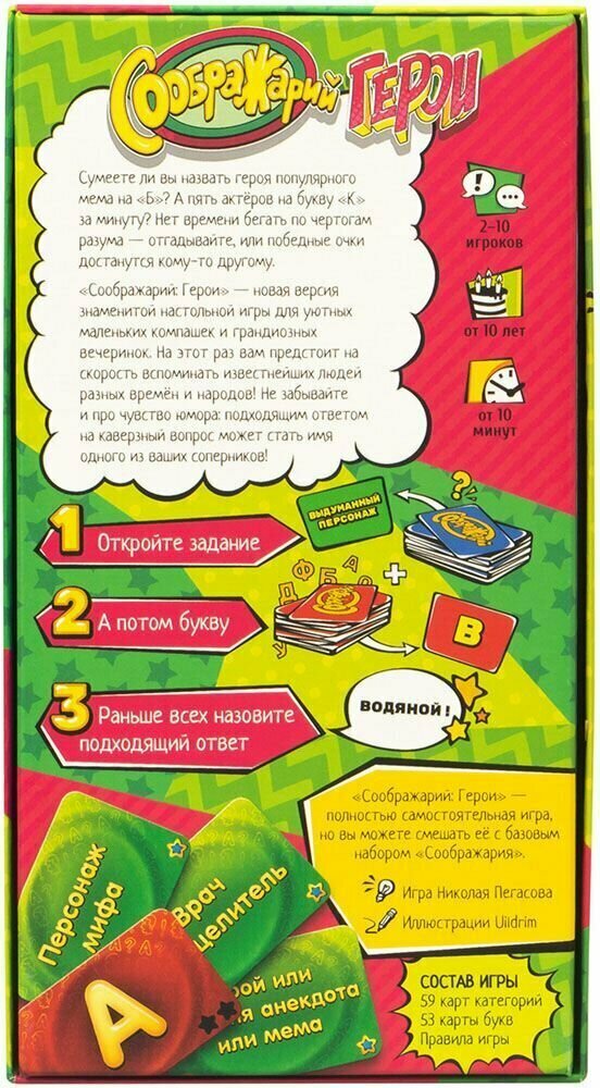 Думать больно, но надоЗнаете правила игры? Ну ладно, рассказываем. Игроки в ряд выкладывают буквы и карточки с темами (в данном случае - с персонажами). Ведущий игрок переворачивает по карточке из каждого ряда и тот, кто быстрее всего сможет назвать персонажа на заданную букву, получает карту категории в качестве победного очка. Буква остается - вам с ней еще играть и играть.