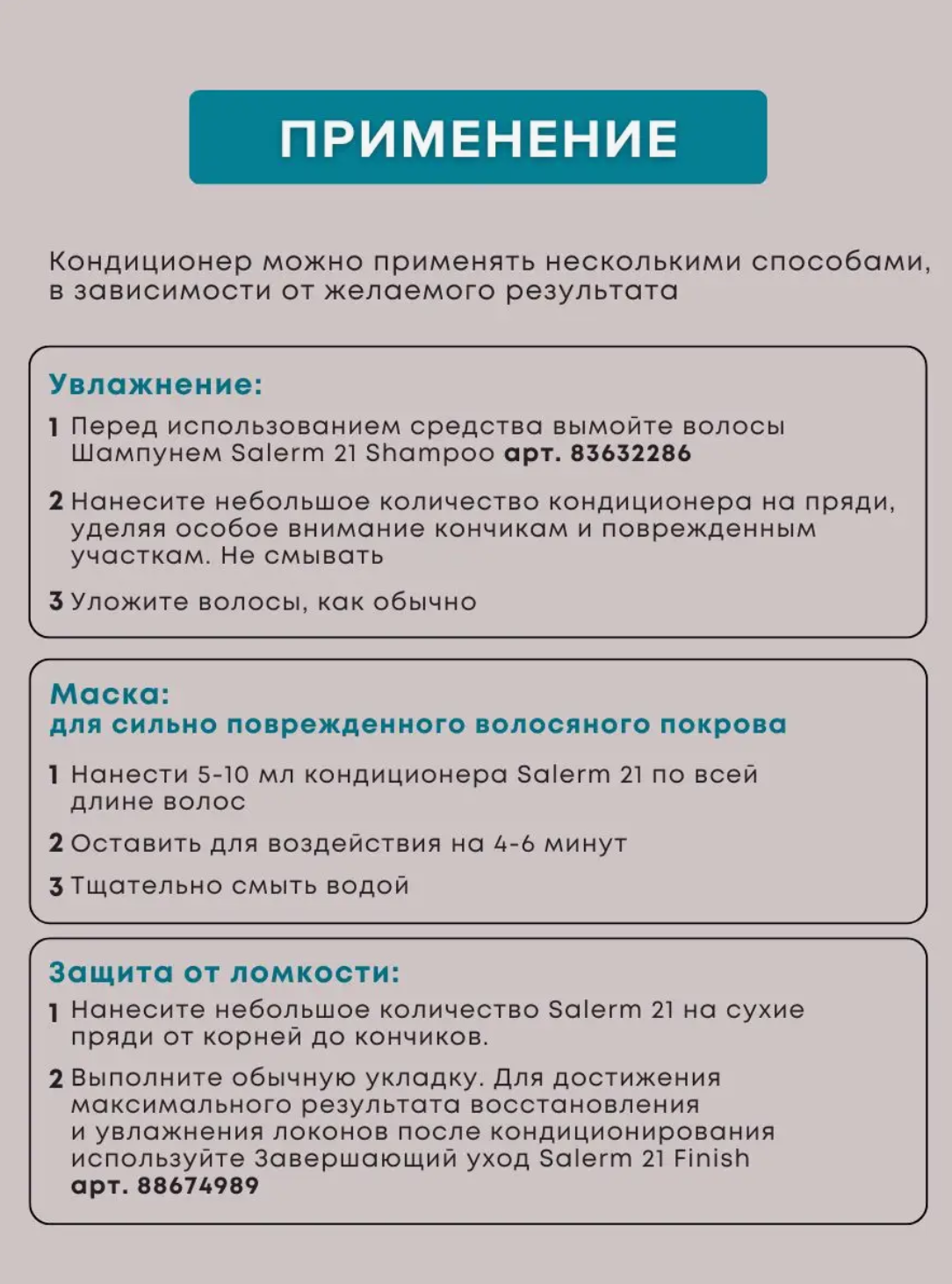 Для достижения максимального результата восстановления и увлажнения локонов после кондиционирования используйте Завершающий уход Salerm 21 Finish.