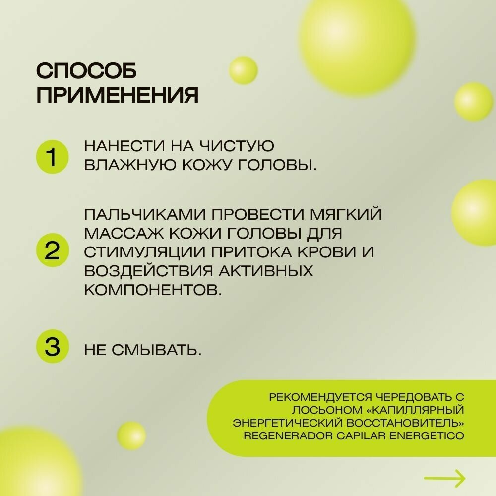 Активизирует жизнедеятельность клеток волосяной луковицы. Повышает жизнеспособность волос. Восстанавливающий лосьон «растительная плацента» — насыщает луковицы волос питательными веществами и повышает сопротивление волос к выпадению. Натуральный кератин возвращает волосам силу и энергию. Видимый эффект уже после первого применения.СПОСОБ ПРИМЕНЕНИЯНанести содержимое одной ампулы на чистую сухую или слегка влажную кожу головы и волосы. Помассировать кожу, чтобы увеличить кровообращение и проникновение продукта. Не смывать.Наносить 1-2 раза в неделю, увеличивая эти периоды по мере уменьшения выпадения волос.Количество: (8х4)х13 мл