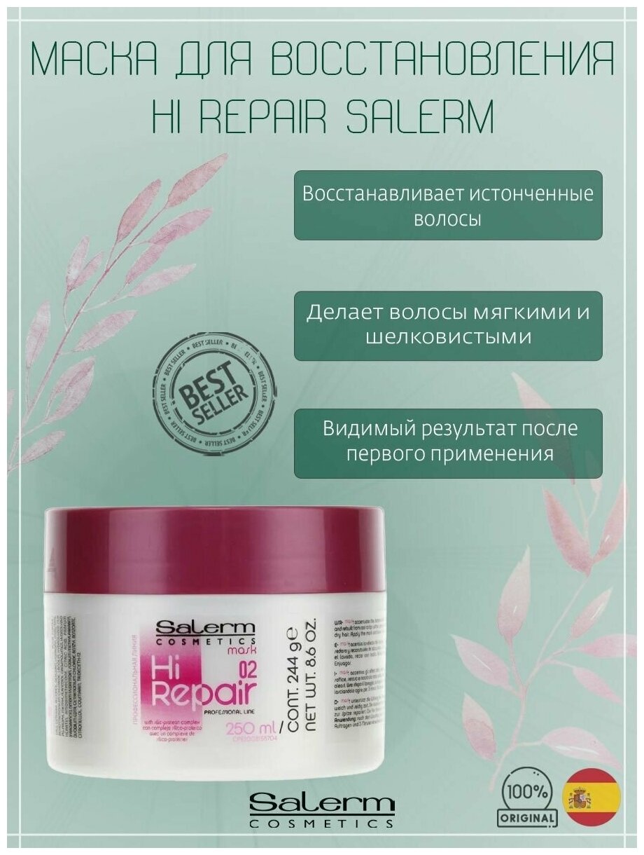 Маска для восстановления волос Salerm Cosmetics Hi-Repair 162 интенсивно восстанавливает структуру волос по всей длине, оставляет волосы шелковистыми и эластичными. Формула продукта последовательного действия возвращает первозданную красоту и блеск поврежденным волосам.