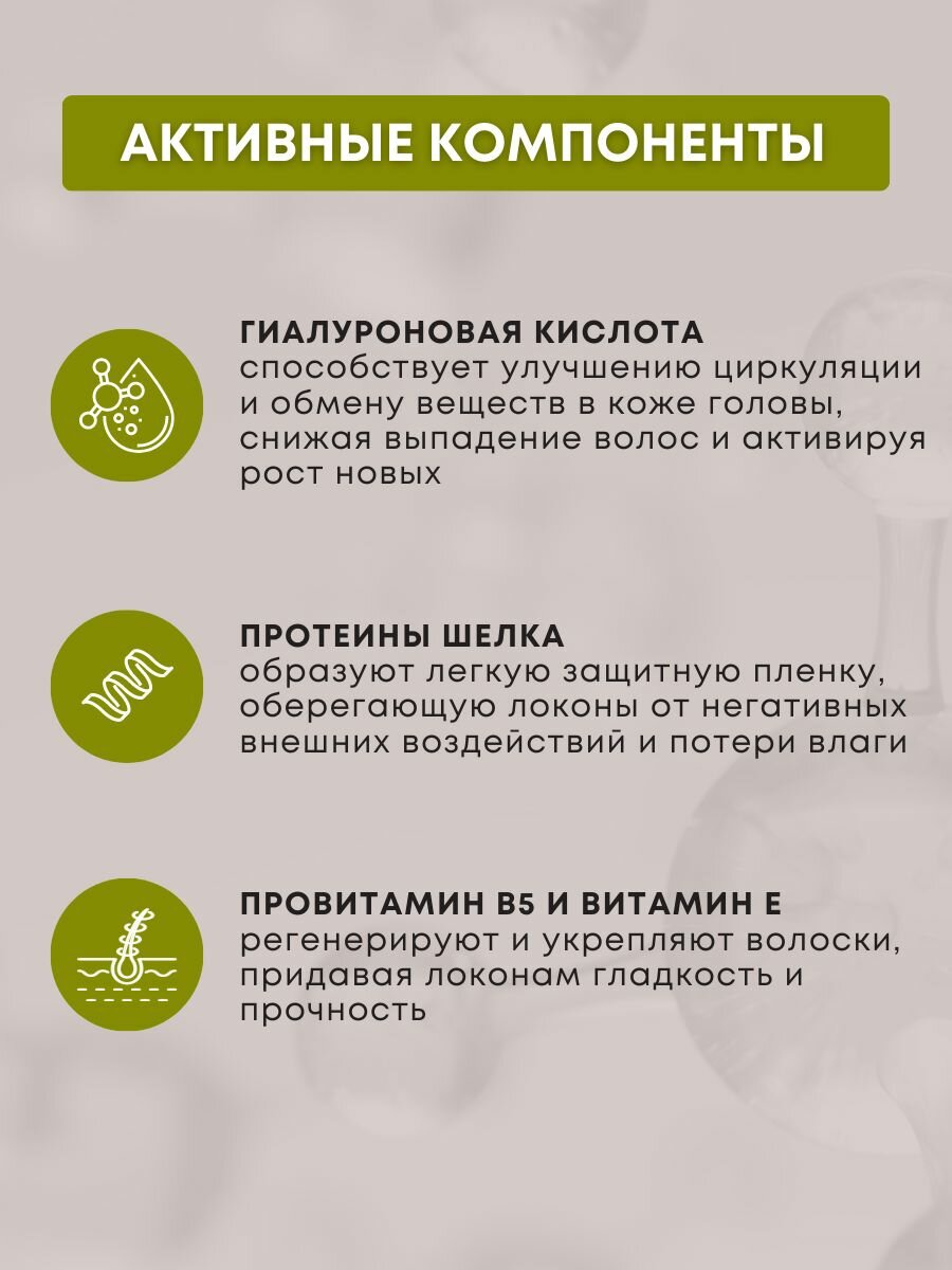 - Гиалуроновая кислота питает фолликулы, способствует улучшению циркуляции и обмену веществ в коже головы, снижая выпадение волос и активируя рост новых. Стимулирует процесс увеличения выработки эластина, коллагена и кератина, повышая прочность и блеск прядей.