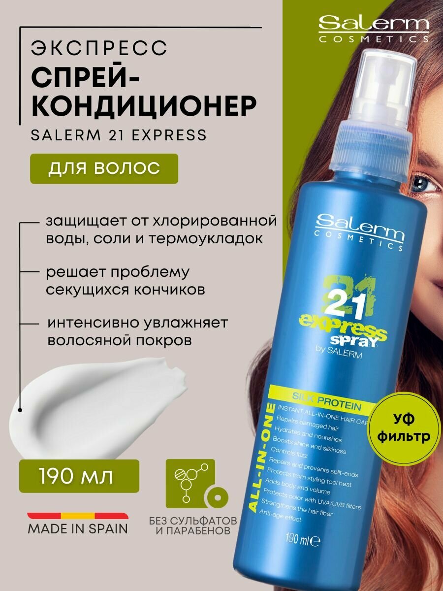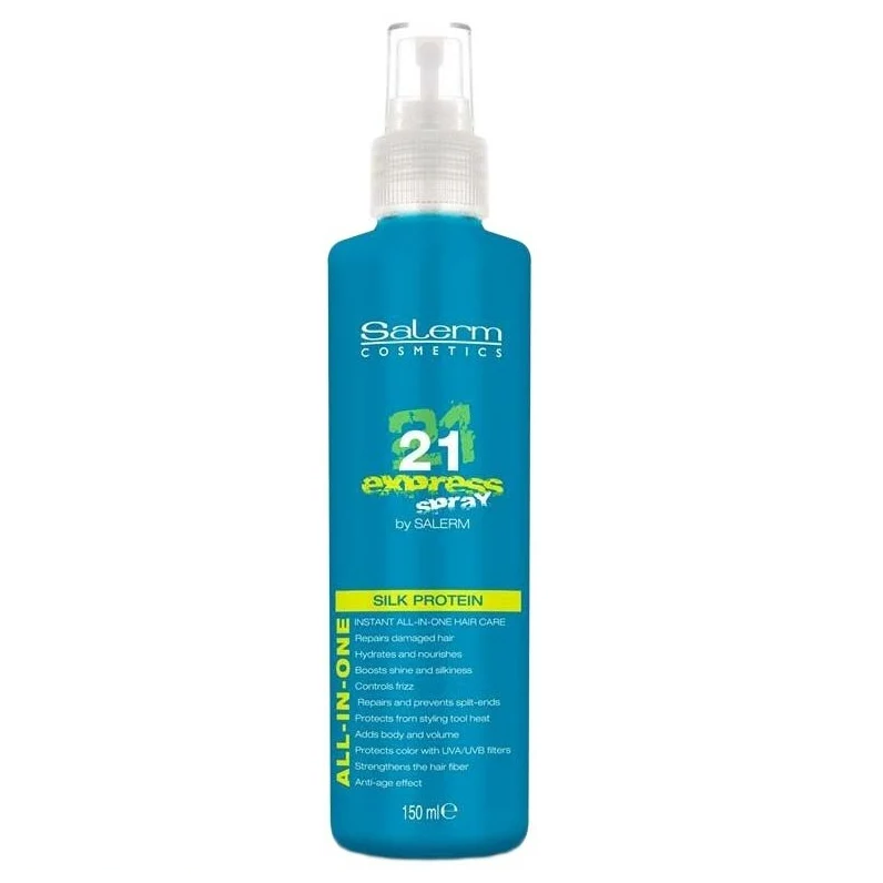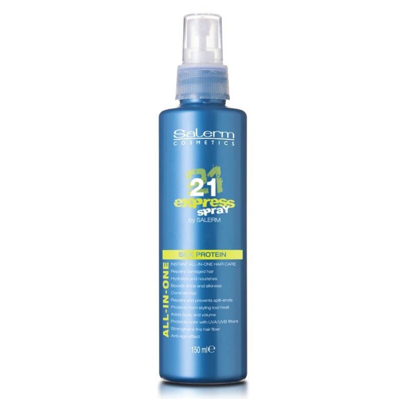 Salerm 21 Express - легкая несмываемая экспресс-маска в виде спрея обладает всеми преимуществами кондиционера, но действует намного быстрее и обладает абсолютно невесомой консистенцией. Идеальный продукт для всех типов волос, особенно, для поврежденных и сухих.