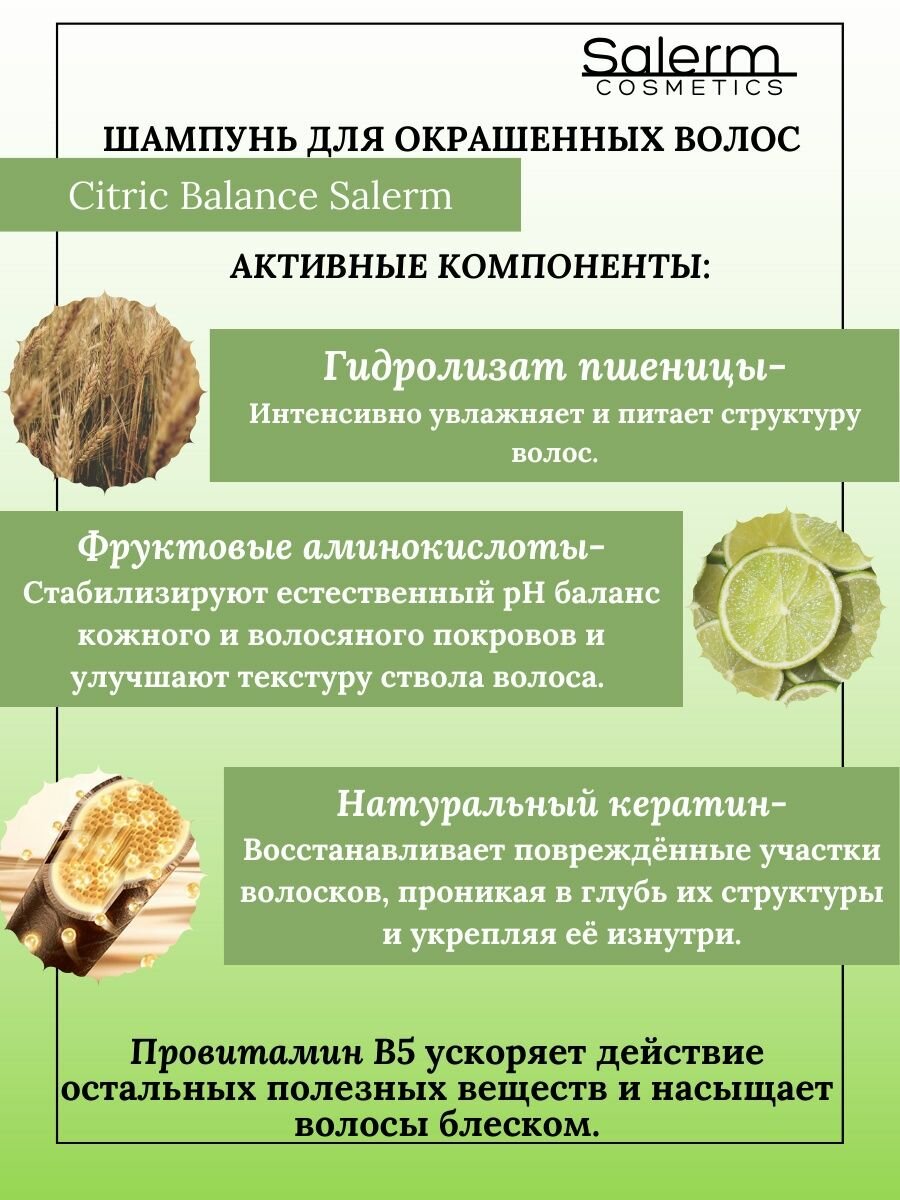 Шампунь для окрашенных волос Citric Balance бережно очищает волосы и кожу головы. Хорошо кондиционирует и увлажняет волосы. Первый шаг в восстановлении кислого баланса волос (pH = 4,9). Рекомендуется в качестве завершающего шампуня после салонной процедуры окрашивания волос.