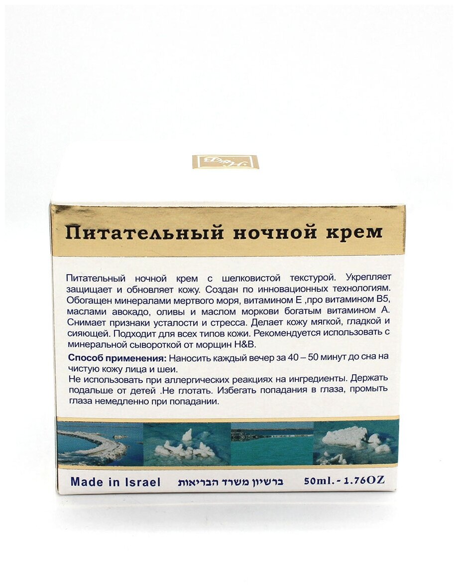 Стимулирует процесс регенерации клеток, нормализует обмен веществ и витаминизирует кожные покровы в ночной период времени. Крем полностью устраняет чувство стянутости и сухости, разглаживает морщины, делает кожу более гладкой и эластичной. Богат витаминами А, С и Е, содержит масла моркови, жожоба, авокадо и оливы, растительными экстрактами и активными минералами Мертвого моря.