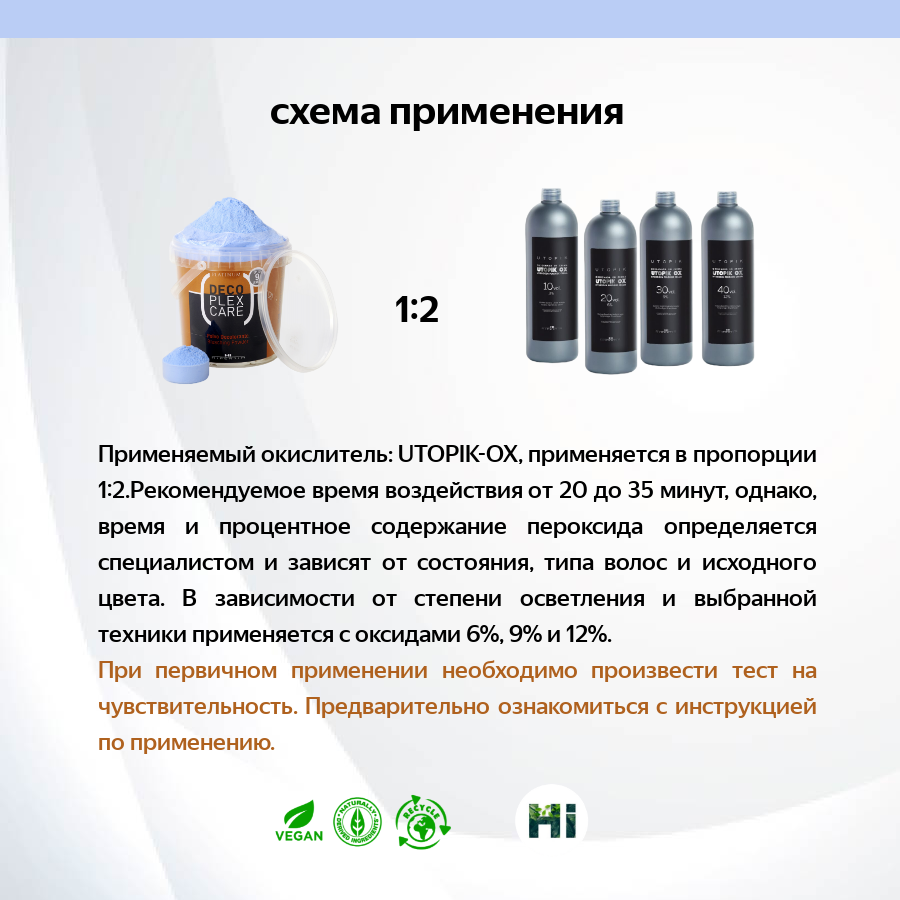Новый «Deco Plex Care» – это новый обесцвечивающий порошок с двойной эффективностью, основанный на технологии PLEX, которая произвела революцию в работе парикмахеров за последние годы: идеальный баланс между максимальной осветляющей способностью (до 9 тонов) и максимальным уходом за волосами! Это не пылящий осветляющий порошок, который подходит для любых техник осветления и выделения. Так как DECO PLEX CARE содержит больше персульфата, он выделяет больше кислорода, так что подъемная сила порошка увеличивается на 2-3 тона по сравнению с другими осветляющими порошками. Усовершенствованная формула также содержит поликонденсированный сахар для дальнейшего снижения агрессивности осветляющего порошка. Применяемый окислитель: UTOPIK-OX, применяется в пропорции 1:2. Рекомендуемое время воздействия от 20 до 35 минут, однако, время и процентное содержание пероксида определяется специалистом и зависят от состояния, типа волос и исходного цвета.