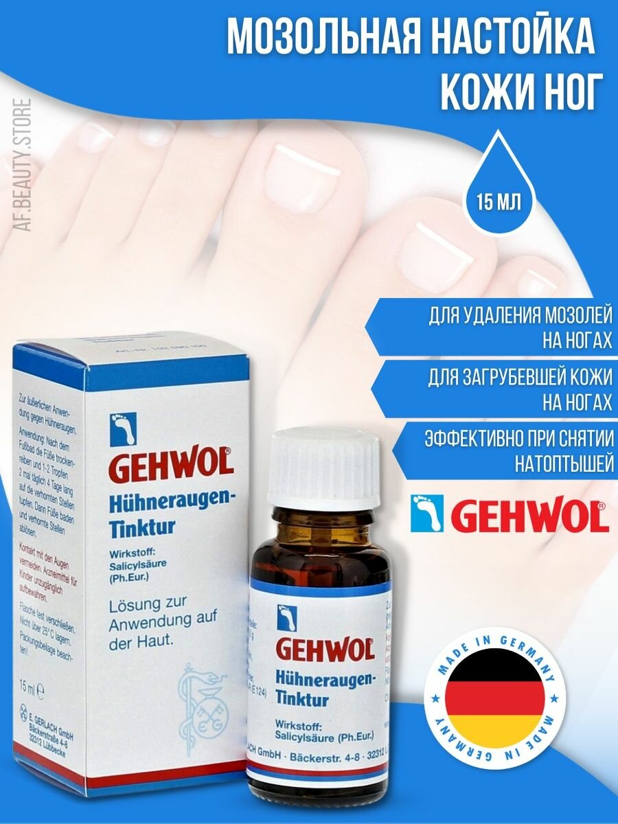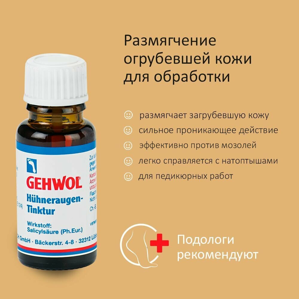 Мозольная настойка Геволь (Gehwol Huhneraugen tinktur) является высококонцентрированным средством с сильным проникающим фактором. Настойка используется для удаления мозолей и загрубевшей кожи. Особенно эффективно при снятии поверхностных мозолей и натоптышей.
