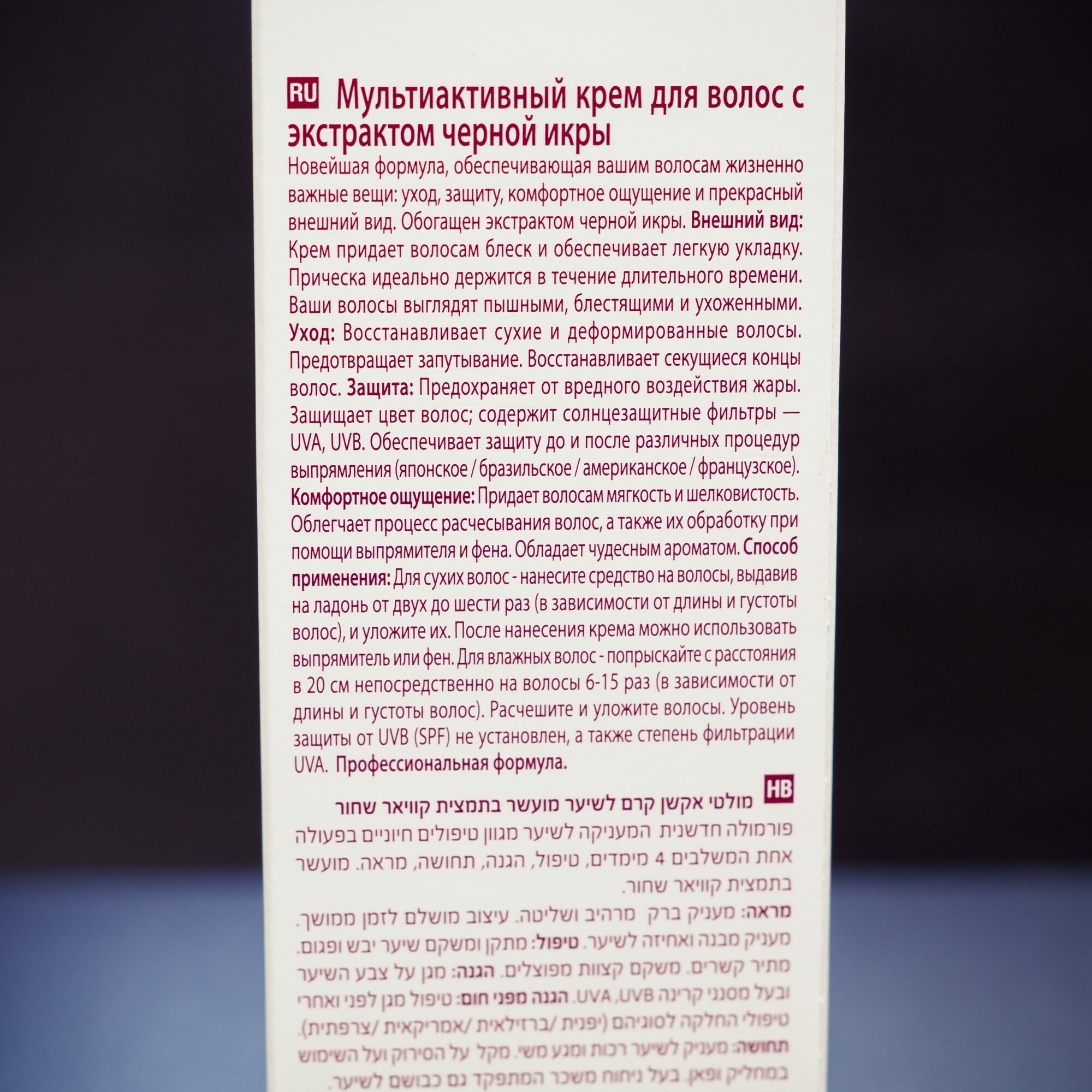 Многофункциональный спрей восстанавливает волосы снаружи и изнутри. Он восстанавливает сухие и ломкие волосы, защищает от спутывания, защищает от воздействия ультрафиолета и пересушивания. Средство интенсивно увлажняет и разглаживает волосы, делает их более сильными и послушными. Экстракт чёрной икры придаёт волосам упругость, гладкость, наполняет здоровьем и сиянием. Хлопковое масло укрепляет и интенсивно восстанавливает волосы. Экстракт персика укрепляет волосы, делает их плотнее и гуще.