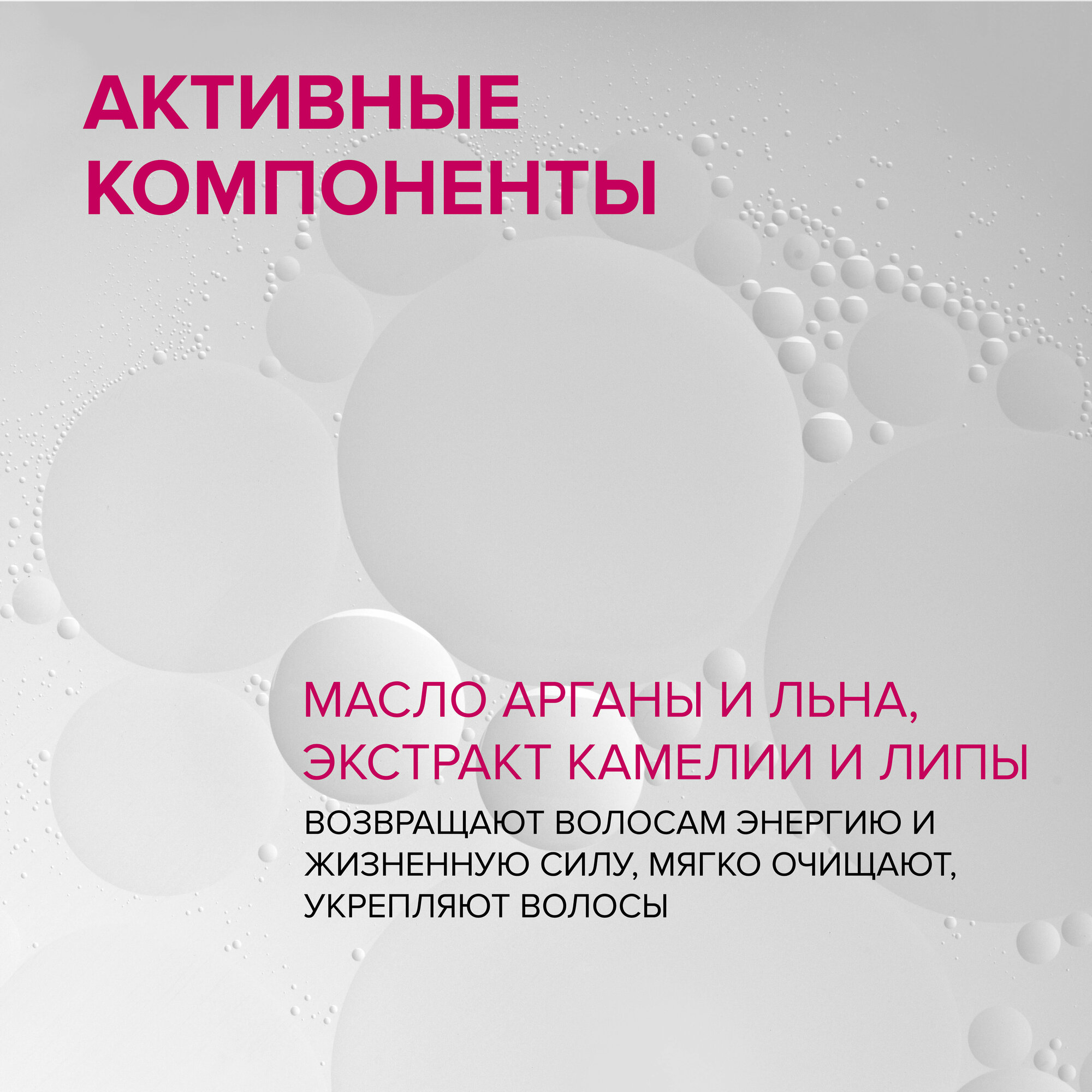 Шампунь мягко очищает, дарит ощущение здоровых и шелковистых волос благодаря входящим в состав маслам арганы и льна, экстрактам камелии и липы. Регулярное использование шампуня вернёт вашим волосам энергию и жизненную силу. Содержание цветочных экстрактов делает его подходящим для ежедневного использования.