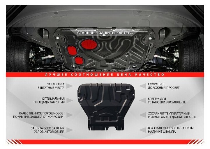 Обращаем ваше внимание, на тот факт, что защита имеет форму, соответствующую модели данного автомобиля. Наличие глубокого штампа и лючков для смены фильтровмасла предусмотрено не на всех защитах. Фото служит для визуального восприятия товара.