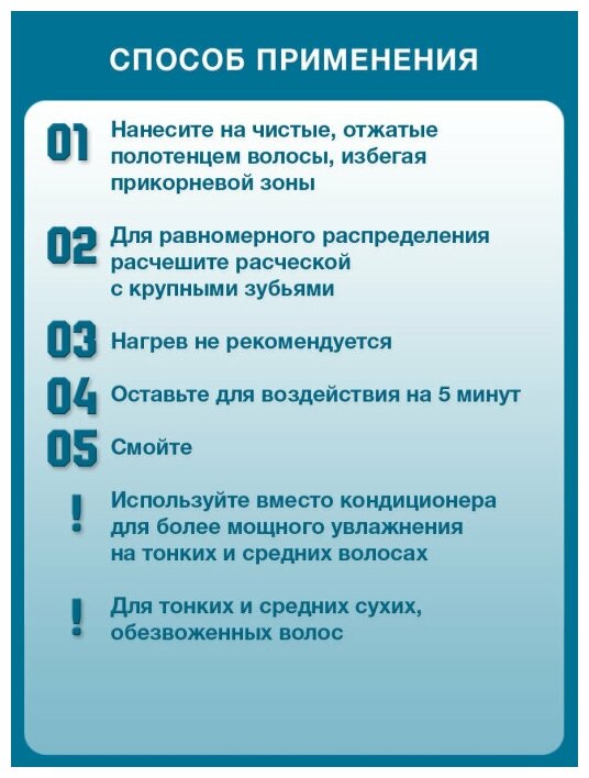 Способ применения: Нанесите средство на отжатые влажные волосы. Распределите по всей длине, отступая от корней. Оставьте на 5 мин. Смойте.