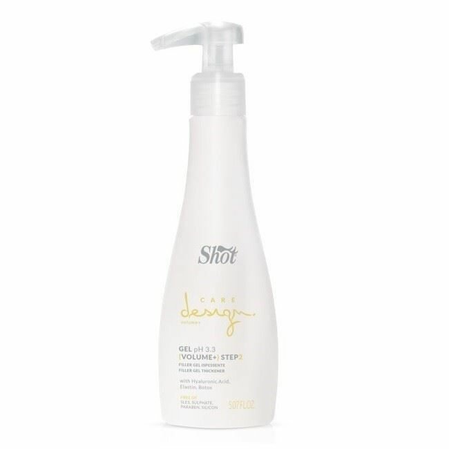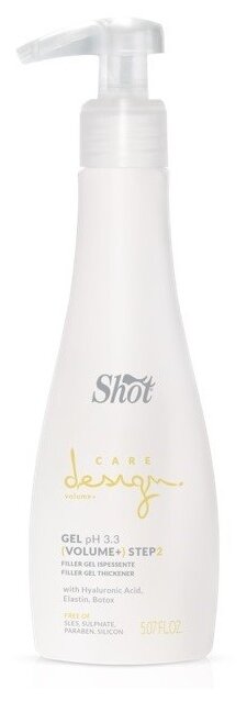 Гель-филлер уплотняющий структуру волос Shot Care Design Volume+ Step 2 Filler Gel Thickener является шагом 2 из 4 в процедуре уплотнения тонких волос. Придает волосам объем и плотность, не содержит сульфаты, парабены и силикон.