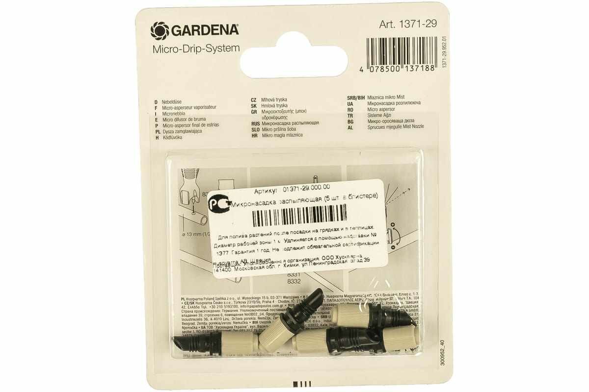 Микронасадка распыляющая GARDENA является элементом системы микрокапельного полива GARDENA Micro-Drip-System и предназначена для полива растений на грядках и в теплицах после посадки. Область полива составляет около 1 метра в диаметре. Повысить уровень расположения микронасадки можно с помощью надставки. Дальность действия микронасадки также регулируется с помощью запорного крана. В комплект поставки входят пять микронасадок.