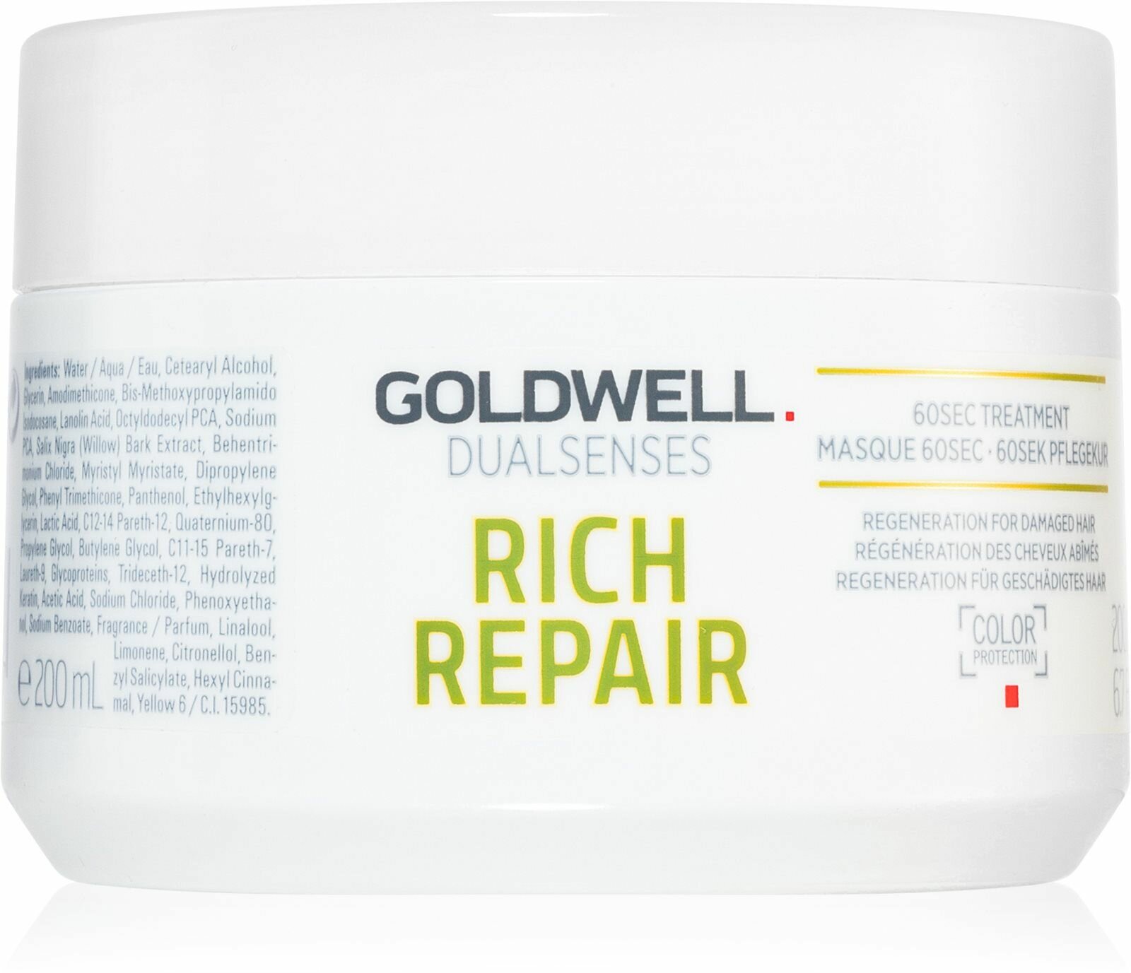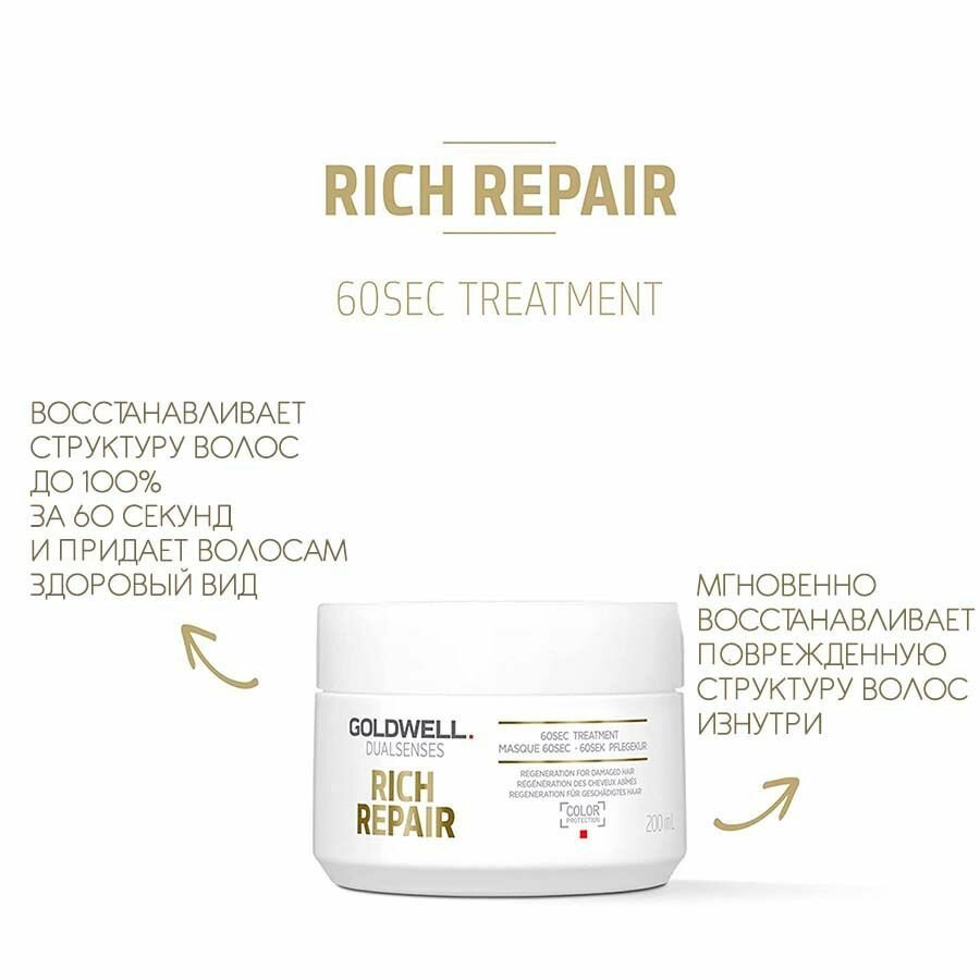 Интенсивная 60-секундная восстанавливающая маска Goldwell Dualsenses Rich Repair 60 Second Treatment с питательной формулой увлажняет и питает поврежденные волосы, восстанавливая их изнутри.Маска была специально разработана для сухих и сильно поврежденных волос. Уникальная система защиты цвета минимизирует вымывание пигмента и выцветание волос, а запатентованный липидный комплекс IntraLipid воздействует на волосы изнутри, придавая им обновленный вид. Он восстанавливает внутреннюю структуру поврежденных волос, возвращая им здоровье и красоту. Восстанавливающей маске требуется всего 60 секунд, для того чтобы полностью обновить структуру волос и вернуть им здоровый вид.Подходит для сухих и поврежденных волос.