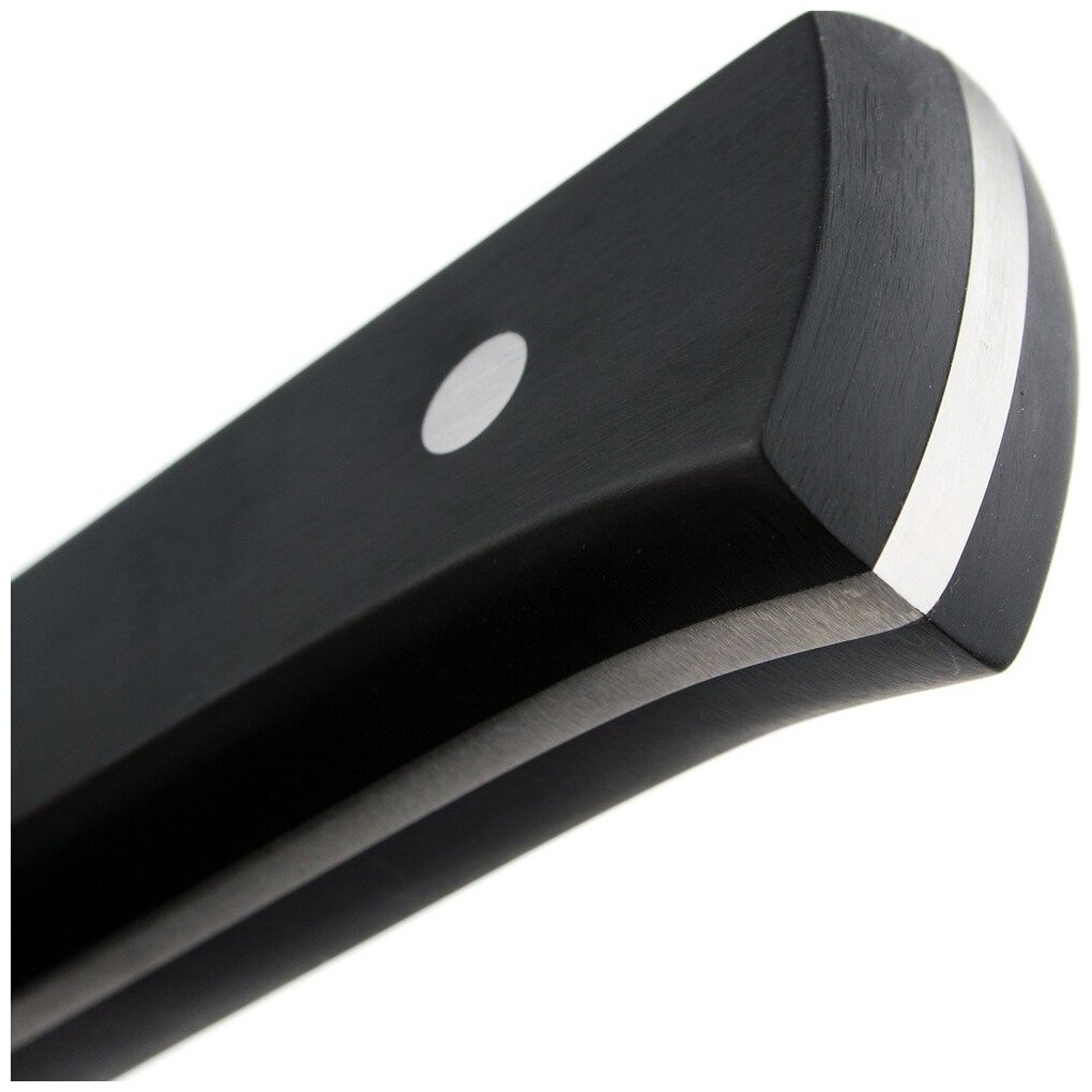 Заточка лезвий – двусторонняя, симметричная, под углом в 20 градусов. Твердость режущей кромки достигает 53-56 HRC, что позволяет оперативно править ее мусатом и одновременно дает хороший длительный рез.