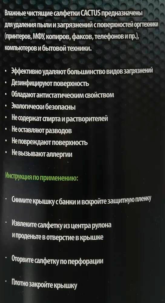 | Дополнительно | Предназначены для удаления пыли и загрязнений с поверхностей оргтехники (принтеров, МФУ, копиров, факсов, телефонов и пр.), компьютеров и бытовой техники. |