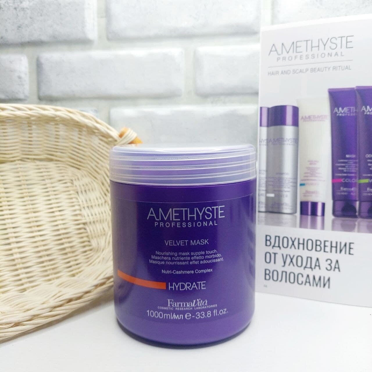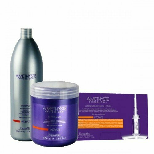 Питательная маска Amethyste Hydrate Velvet для сухих и ослабленных волос. Глубоко питает и увлажняет волосы, придавая им бархатистость от корней до кончиков. Волосы становятся блестящими, мягкими, легко расчесываются. Содержит комплекс Nutri-Cashmere, который обеспечивает интенсивный блеск, улучшает текстуру волос и заметно смягчает волосы. В роскошном средстве Нутри Кашмеа заключается секрет удивительно мягких и соблазнительных волос, блестящих как солнечные лучи. Протеин кашемира защищает волосы, обволакивая их пленкой, восстанавливает водный баланс, придает насыщенный блеск. Активные ингредиенты: комплекс Nutri-Cashmere: Протеины кашемира - защищают волосы благодаря своим уплотняющим свойствам. Протеины имеют высокую молекулярную массу и аминокислотный состав. Способны поглощать и использовать молекулы воды, позволяя поддерживать правильный баланс влаги и придавать волосам блеск. Глицерин - укрепляет и увлажняет. Пантенол - глубоко проникает в структуру и позволяет сбалансировать естественный уровень влаги в волосах. Способ применения: после мытья шампунем нанести маску Amethyste Hydrate на чистые, влажные, подсушенные полотенцем волосы, равномерно распределить по длине. Можно расчесать гребнем с шикокими зубьями для лучшего распределения по волосам. Выдержать 2-3 минуты. Тщательно смыть. Приступить к укладке. Для получения оптимального результата побалуйте себя SPA-процедурой "Роскошный кашемир" - очищение, питание, яркость. Результат - красивые, мягкие и блестящие волосы! 1 шаг: очищение волос и кожи головы шампунем Amethyste Hydrate. Нанесите шампунь на влажные волосы и кожу головы, вспеньте, сделайте легкий массаж в течение нескольких минут. Тщательно смойте шампунь. 2 шаг: питание с маской Amethyste Hydrate. Слегка подсушите волосы полотенцем, равномерно нанесите маску на волосы, выдержите несколько минут, тщательно смойте. 3 шаг: яркость, которую обеспечит волосам лосьон Amethyste Hydrate. Содержимое одной ампулы нанести на чистые влажные волосы, равномерно распределите по длине. Смойте через несколько минут. Наполненная драгоценными протеинами кашемира - эта процедура роскошного лечения является тайной красивых и мягких волос, которые выглядят, как мерцающие кристаллы.