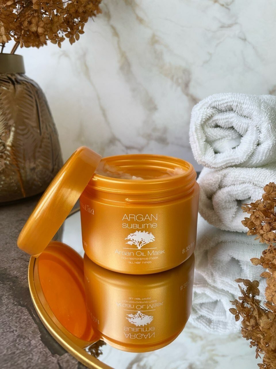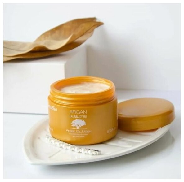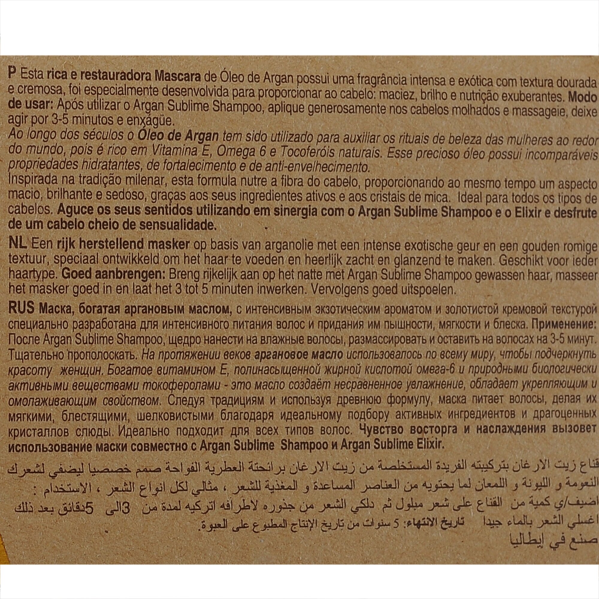 Маска, обогащенная аргановым маслом, с экзотическим ароматом и золотистой кремовой текстурой. Специально разработана для интенсивного питания волос, придания им объема, мягкости и блеска. Идеально подходит для всех типов волос. Способ применения: после использования Argan Sublime Shampoo, щедро нанести на влажные волосы, равномерно распределить и оставить на волосах на 3-5 минут. После тщательно смыть. Активные ингредиенты: cледуя традициям и используя древнюю формулу, маска питает волосы, делая их мягкими, блестящими, шелковистыми благодаря идеальному подбору активных ингредиентов и драгоценных кристаллов слюды.