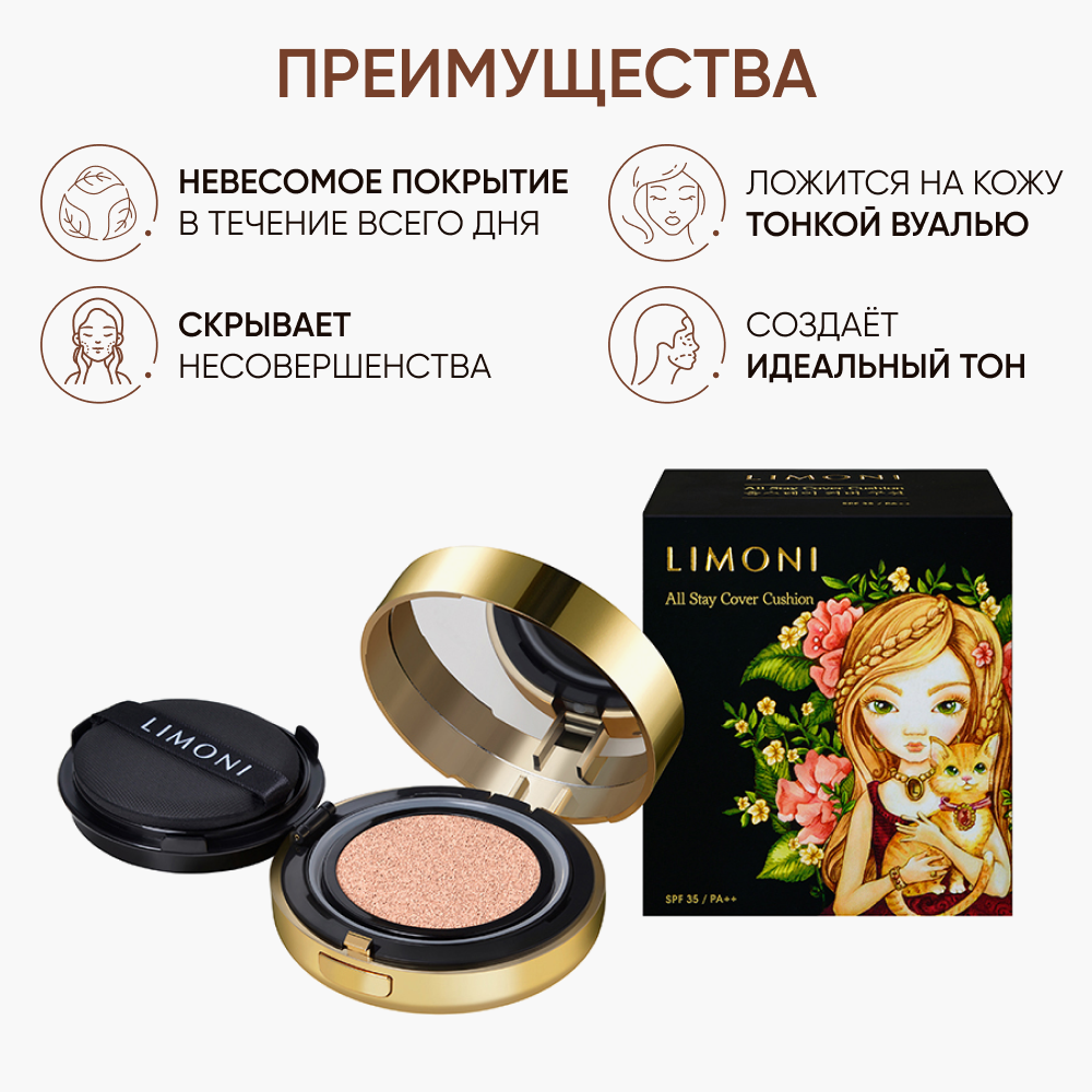 Тональный крем Limoni All Stay Cover Cushion Animal Princess 01 108 г с легчайшей текстурой, которая создает эффект идеально ровной, чистой и нежной кожи. Увлажняющий гель заполняет морщинки и неровности, создавая на поверхности кожи защитную пленку, которая предотвращает потерю влаги. Это позволяет сохранить макияж в течение всего дня.