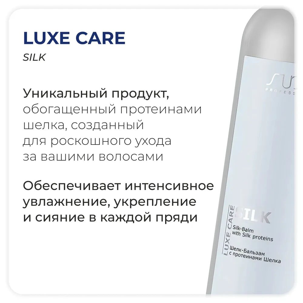 Бальзам с протеинами шелка Luxe Care предназначен для всех типов волос. Входящие в состав протеины шелка и экстракт камелии увлажняют и восстанавливают поврежденные и пористые участки волос, придают прочность, смягчают, дарят зеркальный блеск и шелковистость. Молочная кислота регулирует pH баланс волос.