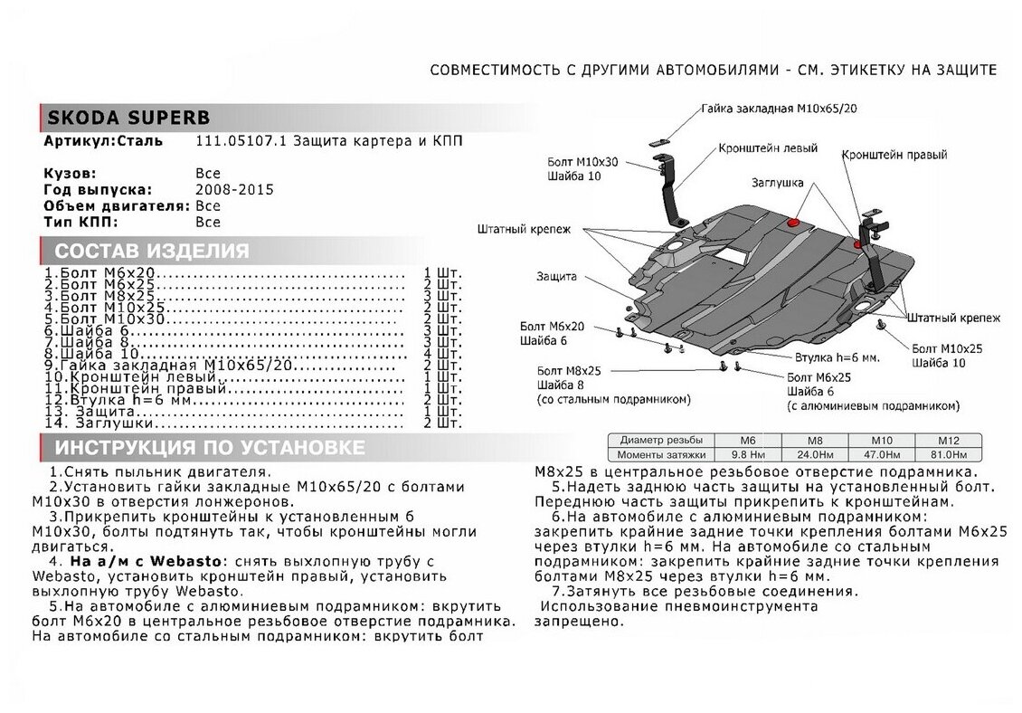 | Комплектация | защита - 1 шт., комплект крепежа, инструкция по установке, упаковка |