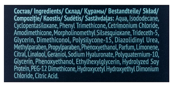 | Состав | Aqua, Isododecane, Cyclopentasiloxane, Phenyl Trimethicone, Cetrimonium Chloride, Amodimethicone, Morpholinomethyl Silsesquioxane, Trideceth-5, Glycerin, Dimethiconol, Polysilycone-15, Diazolidinyl Urea, Methylparaben, Propylparaben, Phenoxyethanol, Parfum, Limonene, Citral, Linalool, Geraniol, Sodium Hyaluronate, Polyquaternium-10, Glycerin, Phenoxyethanol, Ethylhexylglycerin, Hydrolyzed Soy Protein, PEG-12 Dimethicone, Hydroxycetyl Hydroxyethyl Dimonium Chloride, Citric Acid |