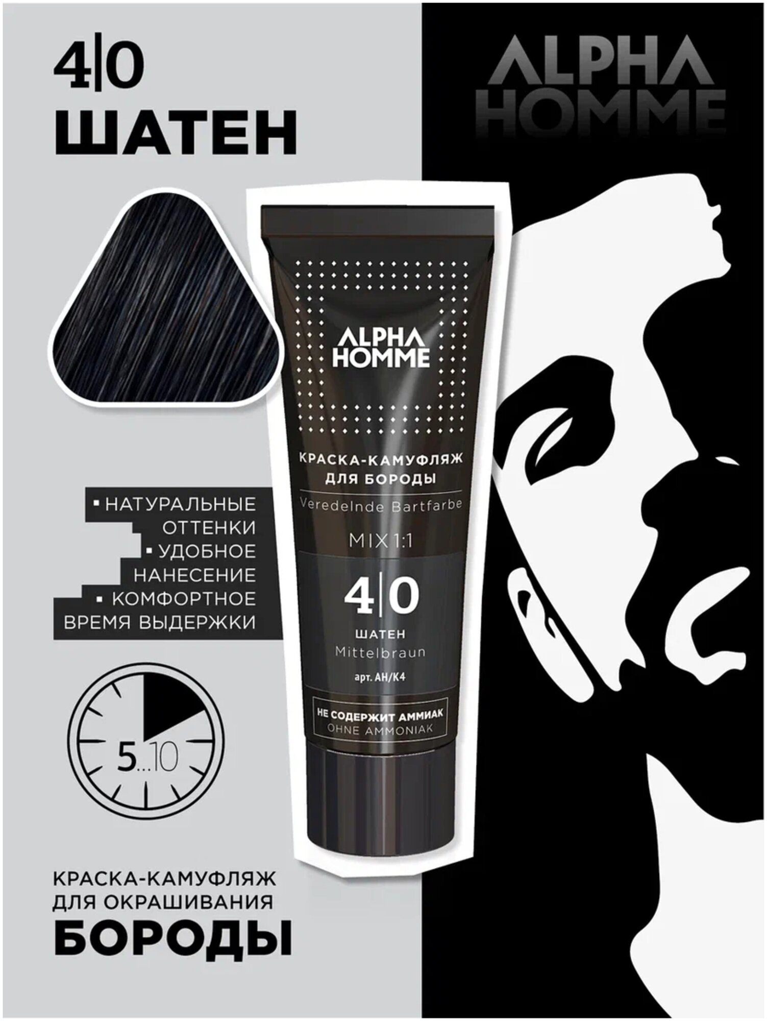 Свобода выбора. Скорость реакции. ALPHA HOMME. Абсолютно натуральные оттенки. Комфортное время выдержки. Отсутствие границы между окрашенными и натуральными волосами. Мягкая формула без аммиака. СПОСОБ ПРИМЕНЕНИЯ: Для приготовления смеси для окрашивания бороды необходимо смешать: 1 часть краски-камуфляж + 1 часть крем-оксигента 3%. Перед началом окрашивания обработайте кожу защитным аква-гелем NO STRESS. Приготовленную смесь нанесите плотным слоем с помощью кисточки или спонжа на сухую чистую бороду/щетину, начиная от внешних краев (висков, зоны бакенбард) по направлению к подбородку и заканчивая усами. Время воздействия - 15 минут с момента последнего нанесения.