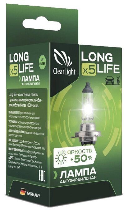 Вы устали постоянно менять лампы головного света? Тогда Clearlight LongLife это ваш выбор! В сравнении со стандартными галогенными лампами они служат до пяти раз дольше! Благодаря инновационным технологиям данные лампы выдают до 50% больше света, чем стандартные галогенные лампы. Clearlight LongLife это идеальное решение для тех, кому важны эффективность и максимальный срок службы автомобильных ламп. ТЕХНОЛОГИИ: в производстве применяется высококачественное кварцевое стекло. Оно прочное, максимальной прозрачности и устойчиво к высоким Температурам. Усовершенствованная нить накаливания увеличивает срок службы и обаладает высокой степенью вибрационной стойкости.