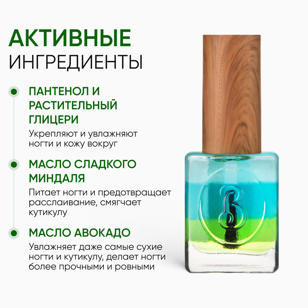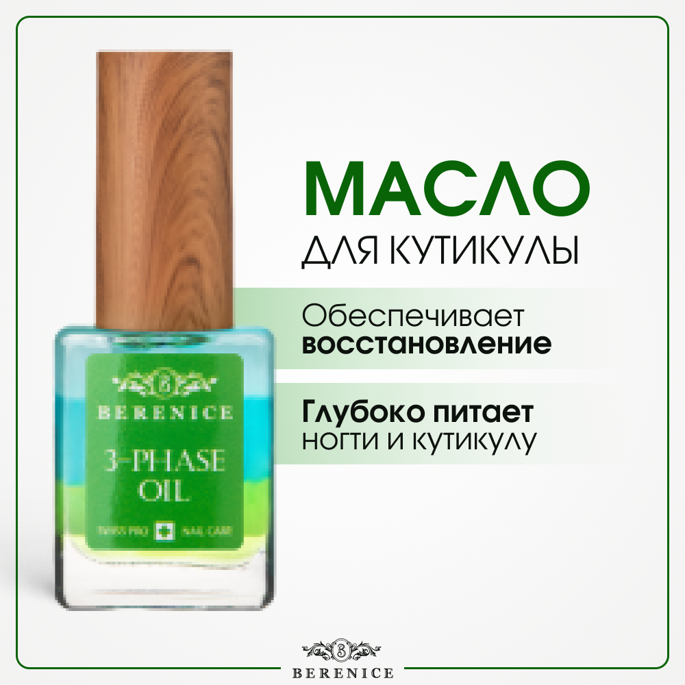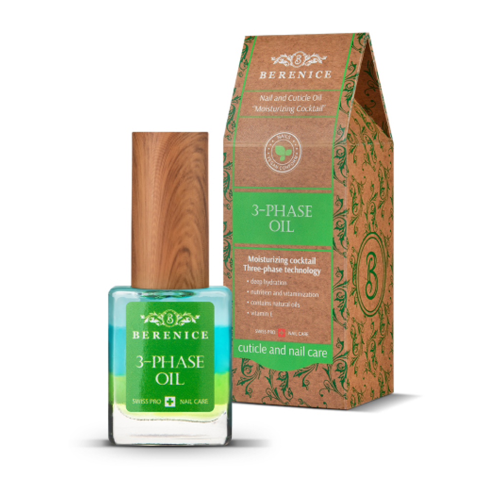 THREE-PHASE OIL – это инновация в уходе за ногтями и кутикулой от BERENICE – трёхфазное масло. Коктейль из трёх видов масел (миндаля, авокадо, мяты) глубоко питает, увлажняет и восстанавливает даже самые сухие и повреждённые ногти. Насыщает ногти витаминами и микроэлементами. Делает кутикулу нежной и ухоженной.Масло входит в новую серию BERENICE Vegan Conform, которая гарантирует максимальную концентрацию активных растительных ингредиентов в каждом средстве, а также отсутствие компонентов животного происхождения. Не тестируется на животных.активные компоненты: пантенол, растительный глицерин, масла сладкого миндаля, авокадо, перечной мяты.рекомендовано для всех типов ногтей, в том числе для сухих и повреждённых.результат: ногти более сильные, кутикула более аккуратная.