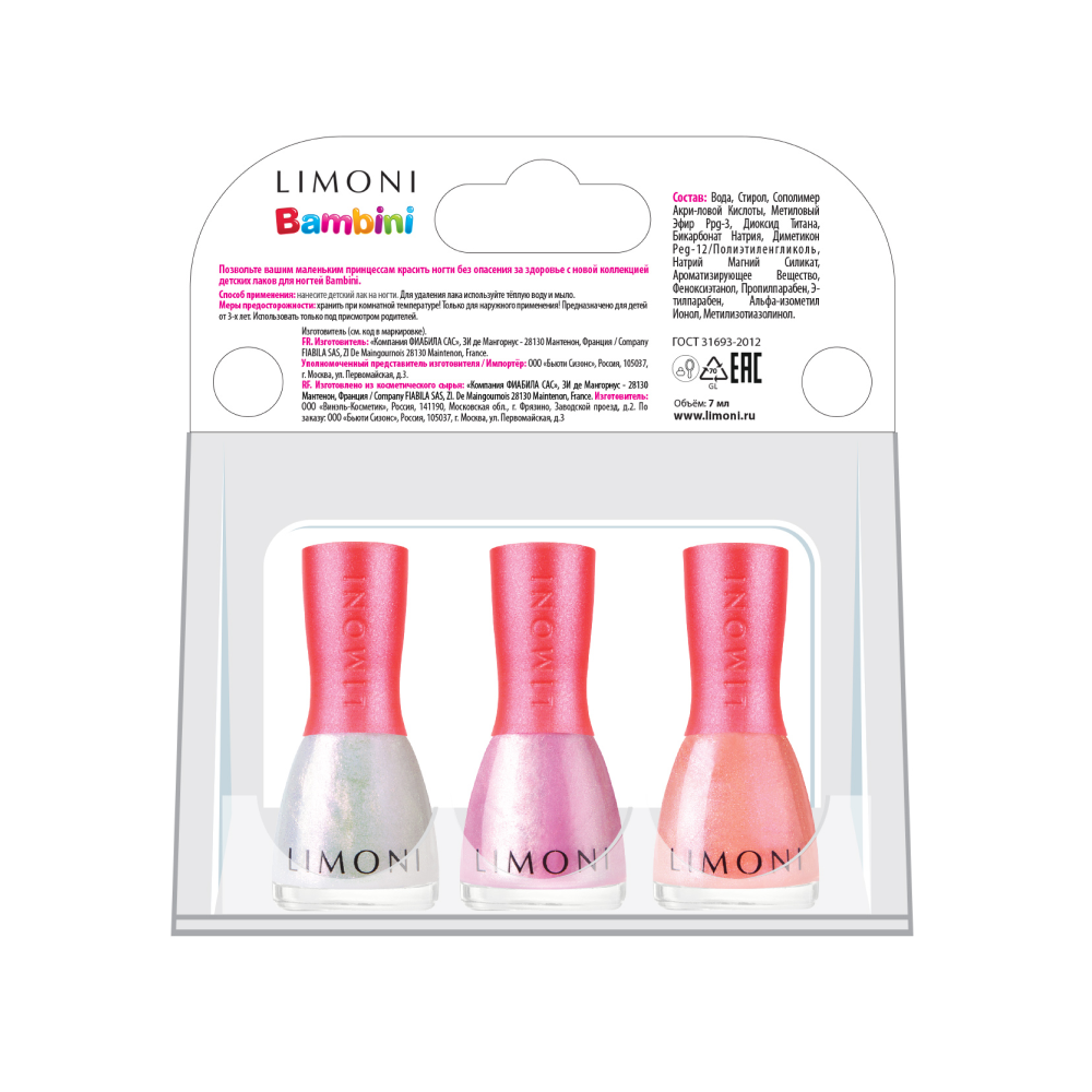 Набор детских лаков для ногтей Bambini от LIMONI Линейка декоративной косметики Bambini от LIMONI специально разработана для маленьких модниц с учетом их пожеланий и пожеланий их родителей. Набор из 3х лаков с нежными цветами и милыми единорожками на упаковке точно понравятся вашим детям! Красиво и безопасно Наши лаки безопасны для детских пальчиков. И благодаря уникальной формуле, они легко смываются теплой водой или влажными салфетками, не требуя использования специальных дополнительных средств. Важно! Предупредите юных красоток, что лаки можно наносить ТОЛЬКО на ногти. Пробовать на вкус их нельзя. Лак горький и не вкусный. Текст при отключенной в браузере загрузке изображений Красота и блеск на максимум Красивый маникюр и без кольца? Ну уж нет! Детям тоже хочется чего-то особенного. Набора из 3х лаков хватит надолго, цвета можно комбинировать, создавая свой уникальный дизайн. А еще его точно хватит на маникюр для подруг. Пригласите их на бьюти-вечеринку с вкусняшками и мультиками. И разделите вместе с ними ритуалы красоты ? Способ применения Нанести лак на ногти. Смывается теплой водой. Время высыхания одного слоя 5-7 минут