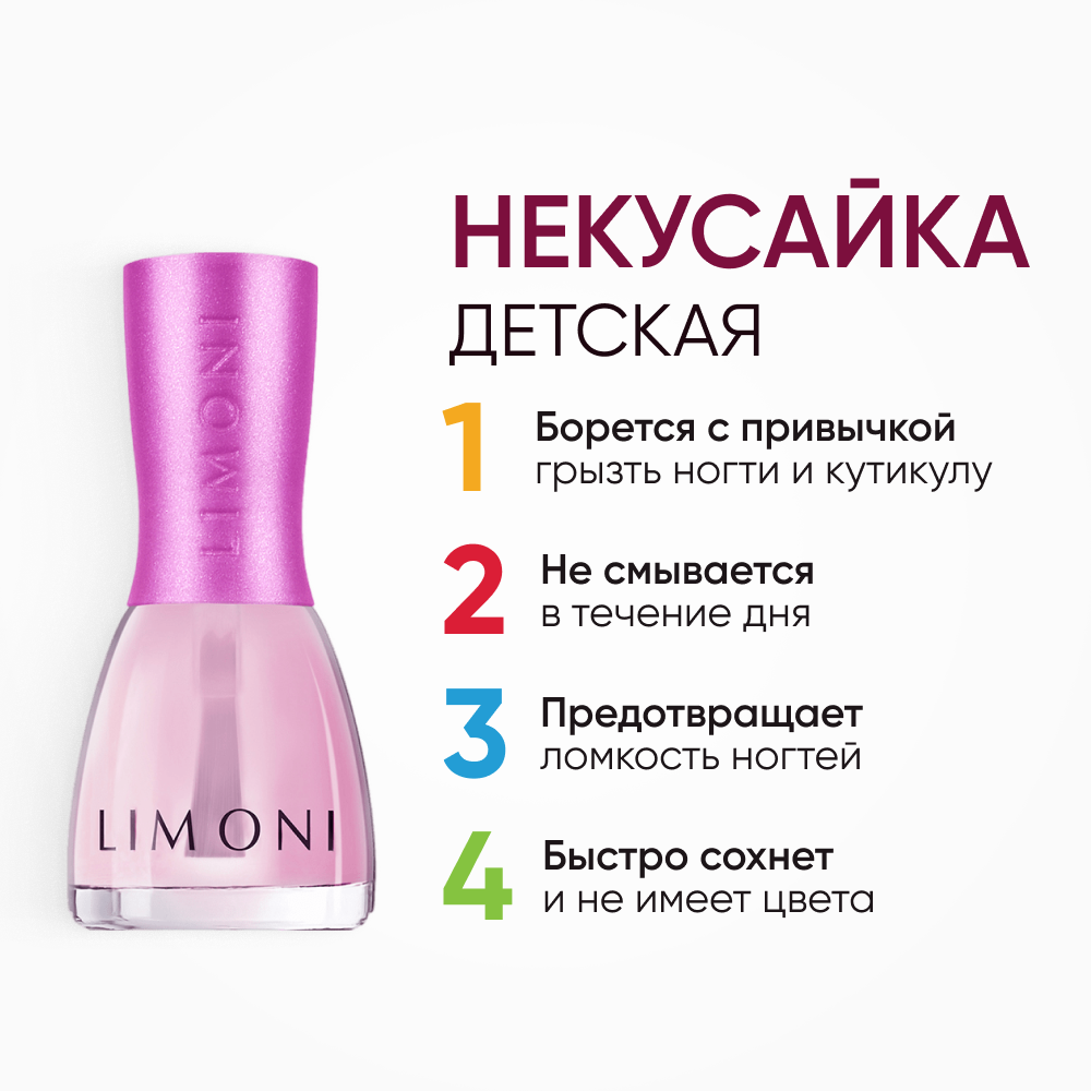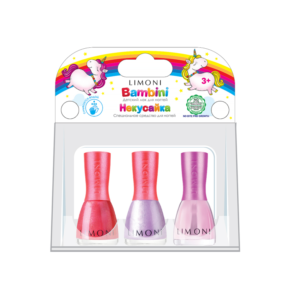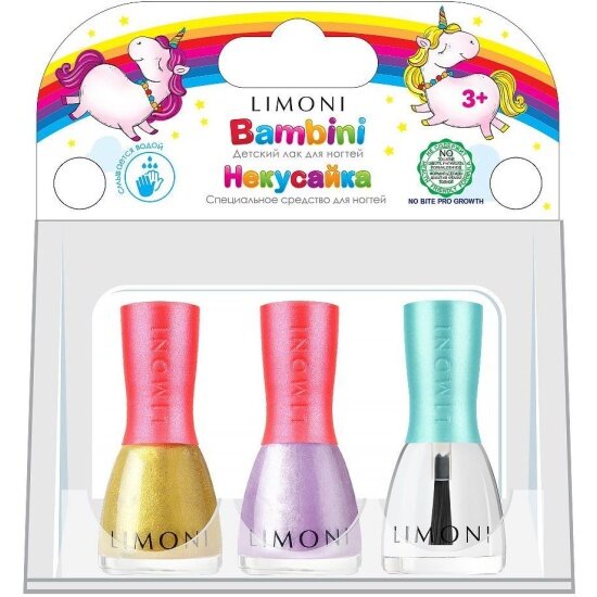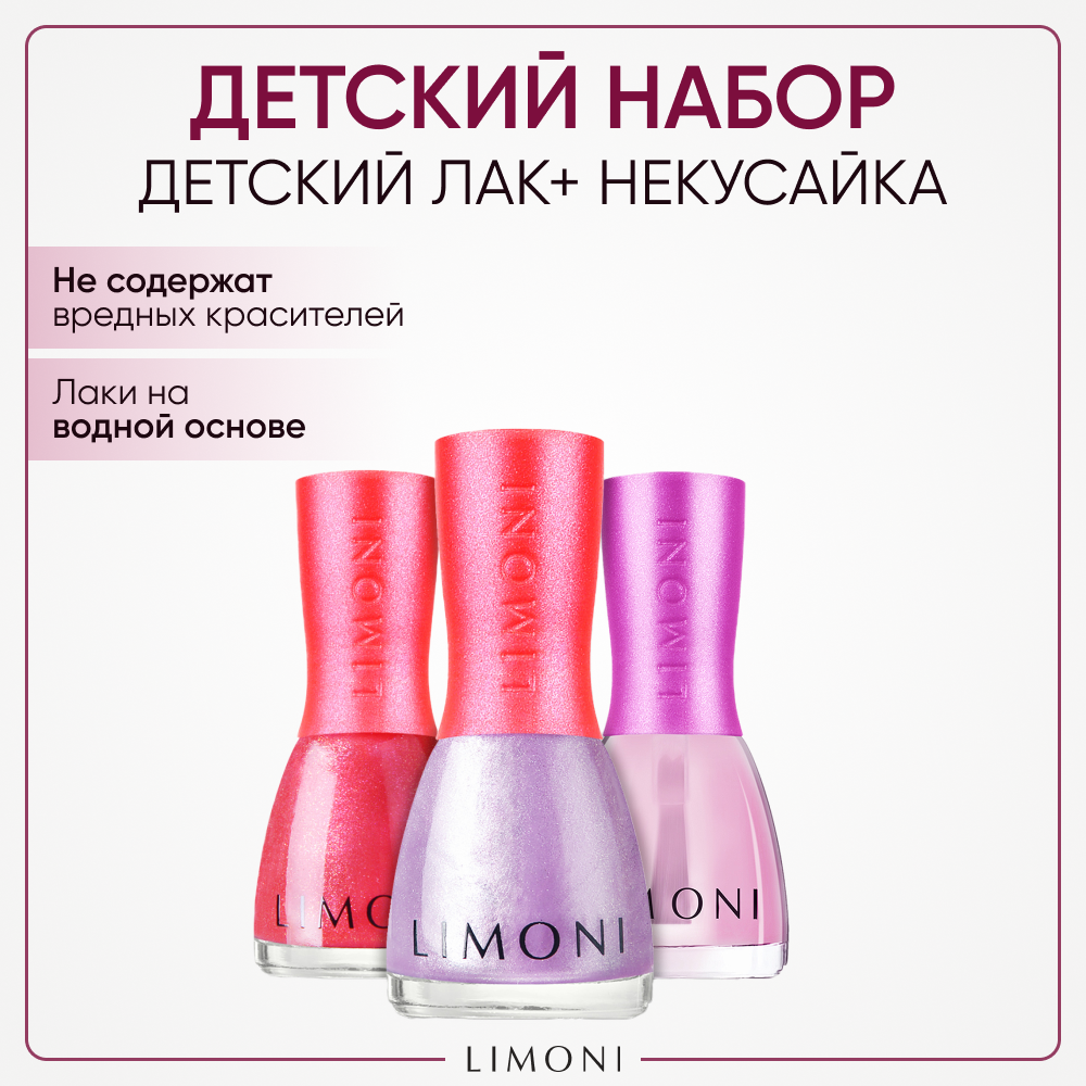 Стильный маникюр для маленькой принцессы без вреда для здоровья-не сказка!Маленькие модницы мечтают быть похожими на своих мам. Поэтому флакончики в точности повторяют дизайн "взрослых" лаков для ногтей LIMONI. Благодаря тому, что лак легко смывается водой, можно перекрашивать ногти столько раз, сколько пожелает маленькая принцесса. Вам понадобится буквально пара минут, чтобы безопасно сменить образ. Радости и восторгу юной леди не будет предела. Меняйте цвет по настроению, под цвет наряда, под цвет бантиков или любимой игрушки. Ваша красавица будет всегда в центре внимания-будь то праздник, прогулка или обычный день в саду. Средство держится до тех пор, пока девочка не решит его смыть.Лаки для ногтей на водной основе, поэтому не вредны для здоровья и легко смываются теплой водой. В составе отсутствуют ацетон, вредные красители, компоненты животного происхождения, в составе нет фруктово-ягодных отдушек.В набор входит два популярных оттенка и средство Некусайка:Тон 04 - Любопытный рог Сочный оттенок с мелким шиммером похож на спелую малинку. Яркий, ягодный, он точно придётся по душе маленьким модницам.Тон 06 - Winged Angel / Крылатй Ангел. Сказочный лавандовый оттенок с голубым шиммером.Средство "Некусайка" устойчиво к мытью рук в течение всего дня. Эффективно борется с привычкой грызть ногти и кутикулу. Средство создает усиленный защитный слой, предотвращающий ломкость ногтей. Подходит девочкам и мальчикам.