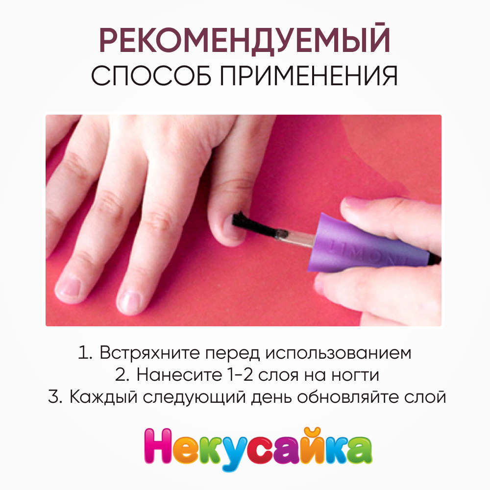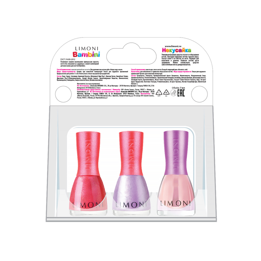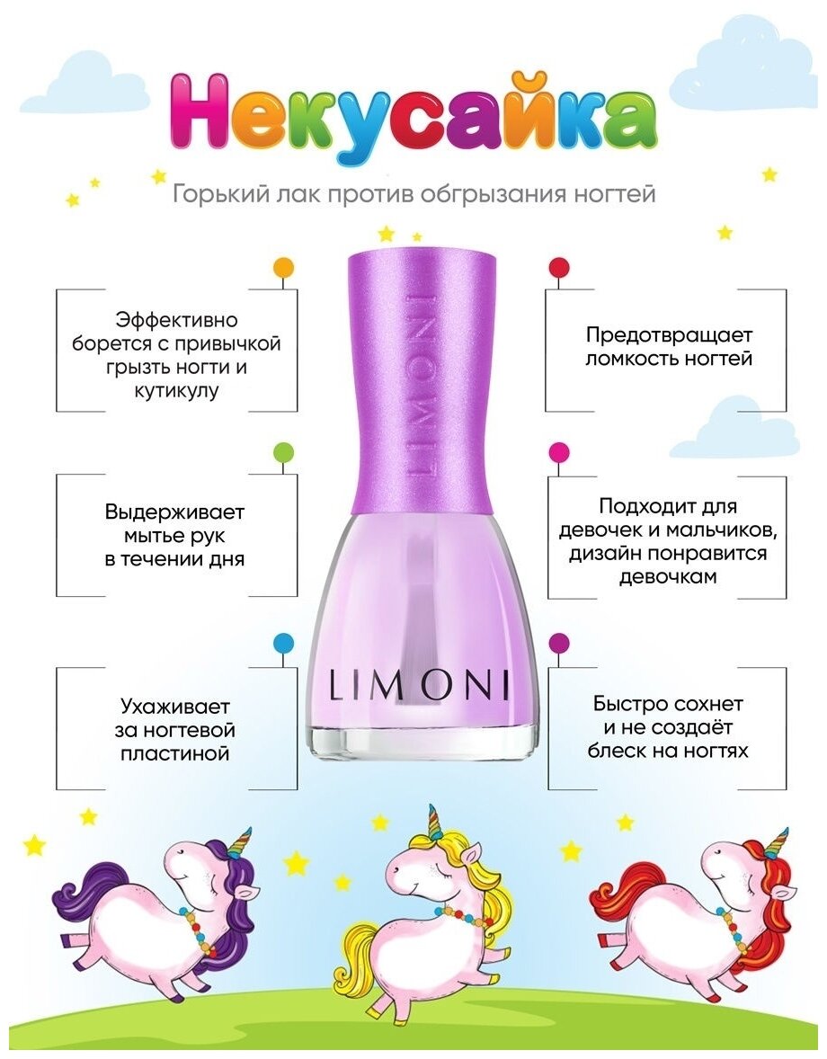 Стильный маникюр для маленькой принцессы без вреда для здоровья-не сказка!Маленькие модницы мечтают быть похожими на своих мам. Поэтому флакончики в точности повторяют дизайн "взрослых" лаков для ногтей LIMONI. Благодаря тому, что лак легко смывается водой, можно перекрашивать ногти столько раз, сколько пожелает маленькая принцесса. Вам понадобится буквально пара минут, чтобы безопасно сменить образ. Радости и восторгу юной леди не будет предела. Меняйте цвет по настроению, под цвет наряда, под цвет бантиков или любимой игрушки. Ваша красавица будет всегда в центре внимания-будь то праздник, прогулка или обычный день в саду. Средство держится до тех пор, пока девочка не решит его смыть.Лаки для ногтей на водной основе, поэтому не вредны для здоровья и легко смываются теплой водой. В составе отсутствуют ацетон, вредные красители, компоненты животного происхождения, в составе нет фруктово-ягодных отдушек.В набор входит два популярных оттенка и средство Некусайка:Тон 04 - Любопытный рог Сочный оттенок с мелким шиммером похож на спелую малинку. Яркий, ягодный, он точно придётся по душе маленьким модницам.Тон 06 - Winged Angel / Крылатй Ангел. Сказочный лавандовый оттенок с голубым шиммером.Средство "Некусайка" устойчиво к мытью рук в течение всего дня. Эффективно борется с привычкой грызть ногти и кутикулу. Средство создает усиленный защитный слой, предотвращающий ломкость ногтей. Подходит девочкам и мальчикам.