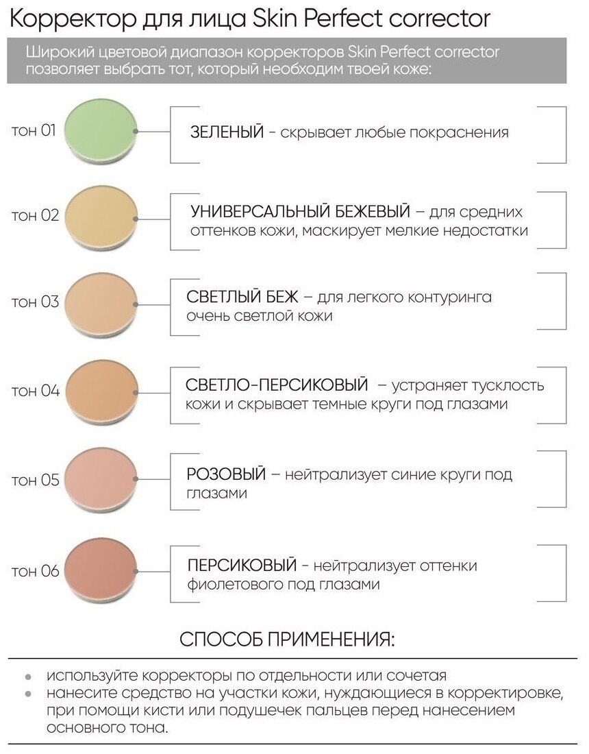 Skin Perfect Corrector из серии LIMONI Professional это профессиональное средство для коррекции несовершенств кожи. Прекрасно маскирует темные круги, неровности и покраснения, выравнивая цвет и тон кожи. Нежная кремовая текстура корректора легко распределяется, делая кожу совершенной. Имеющиеся в составе минералы - защищают от УФ лучей, обладают противовоспалительным свойством. Подойдет для нормальной и сухой кожи. Корректоры представлены в 6 различных оттенках и подбираются индивидуально в зависимости от поставленных задач. Зеленый корректор отлично маскирует покраснения, персиковые корректоры скрывают темные круги с зеленым или коричневым подтоном, корректоры с розовым пигментом маскируют темные круги с фиолетовым подтоном.
