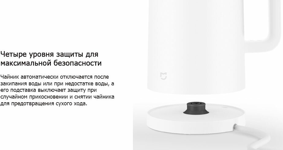 Чайник Xiaomi Mijia Electric Kettle 1A Быстрый нагрев и мощность 1800 ВтMijia Electric Kettle 1A оснащен эффективным кольцевым нагревателем мощностью 1800 Вт, который может вскипятить целый чайник воды всего за 5 минут. Два слоя для защиты от ожогов Внутренняя камера Mijia Electric Kettle 1A имеет двухслойную конструкцию с термоизолирующей пустотелой прослойкой, защищающей самые нежные ручки от ожогов. Английский температурный контроллер Чутко следит за состоянием воды В чайнике Mijia Electric Kettle используется высокоточный английский контроллер температуры, который следит за закипанием воды и вовремя отключает питание.Большая горловина для удобной чистки Горловина Mijia Electric Kettle 1A, диаметром 13 см, открывает доступ к цельной внутренней камере для удобной очистки и ухода.Цельная камера из стали AISI 304 Полная безопасность для здоровья Внутренняя камера чайника выполнена из безопасной нержавеющей стали сорта AISI 304, которая благодаря своим свойствам широко применяется в медицине и изготовлении посуды. Кроме того, камера совершенно не имеет внутренних сварных швов, на ней не задерживается грязь, и ее удобно мыть.Минималистичный дизайн Совмещает практичность и красоту Внешний корпус Mijia Electric Kettle 1A выполнен из качественного матового полипропилена, подчеркивающего достоинства скромного дизайна, воплощая в себе безупречный вкус. Объем 1.5 л Ёмкости Mijia Electric Kettle 1A может хватить на целый день или просто для большой компании, чтобы лишний раз не бегать за водой. Четыре уровня защиты для максимальной безопасности Чайник автоматически отключается после закипания воды или при недостатке воды, а его подставка выключает защиту при случайном прикосновении и снятии чайника для предотвращения сухого хода.