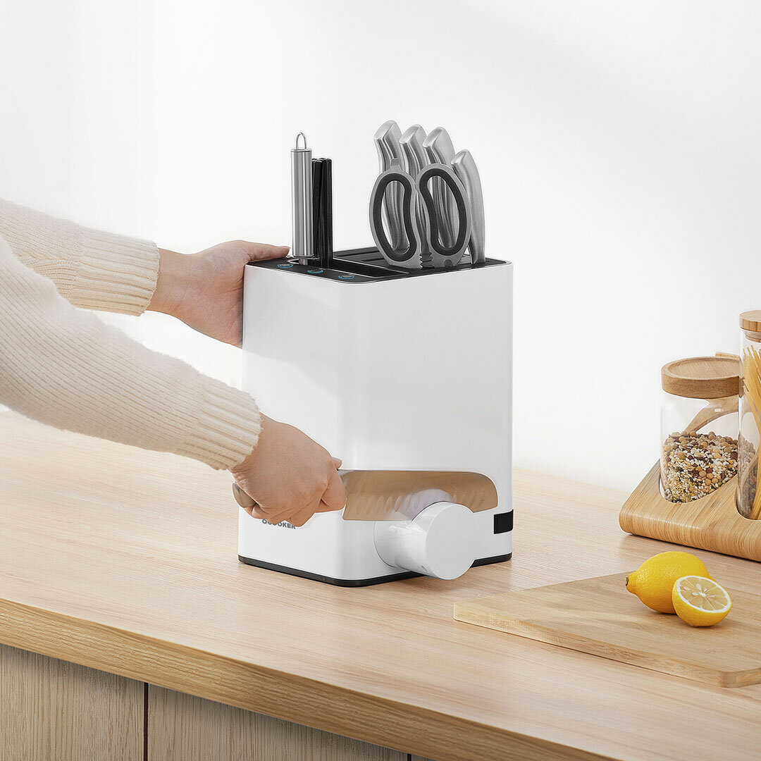 Подставка для ножей HuoHou UVC Disinfectant Knife Holder (HU0123) также является УФ-стерилизатором. Как только ножи будут вставлены внутрь, просто нажмите кнопку на передней панели, чтобы начать стерилизацию УФ лучами. Панель держателя ножа производится из гипоаллергенного материала, его можно без проблем чистить (достаточно снять основу).